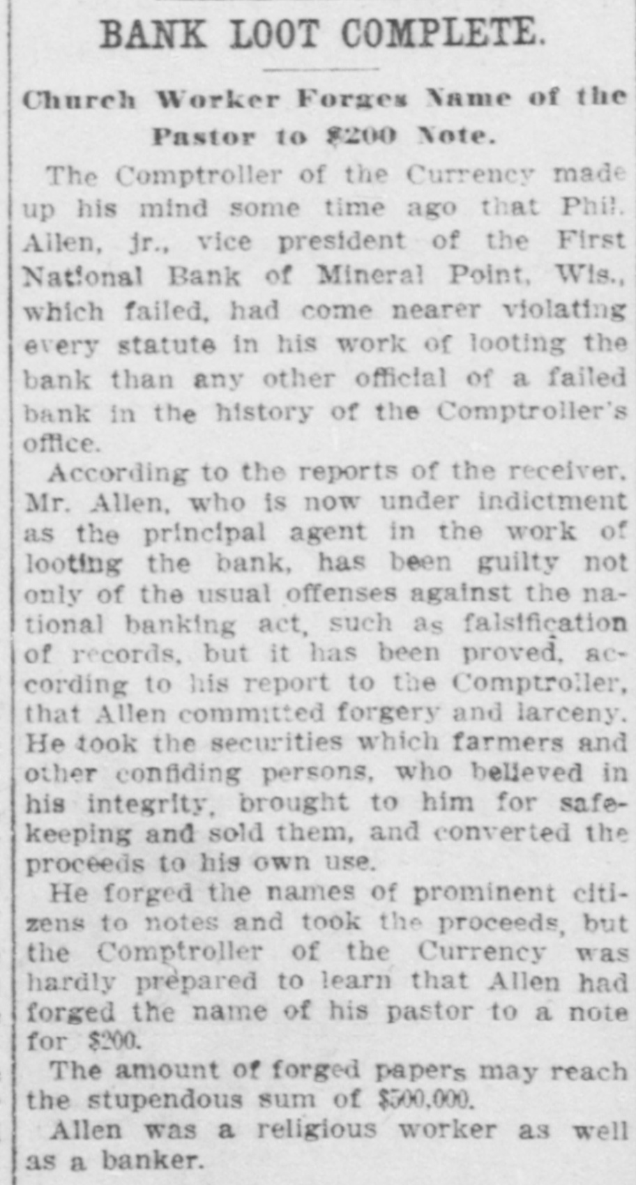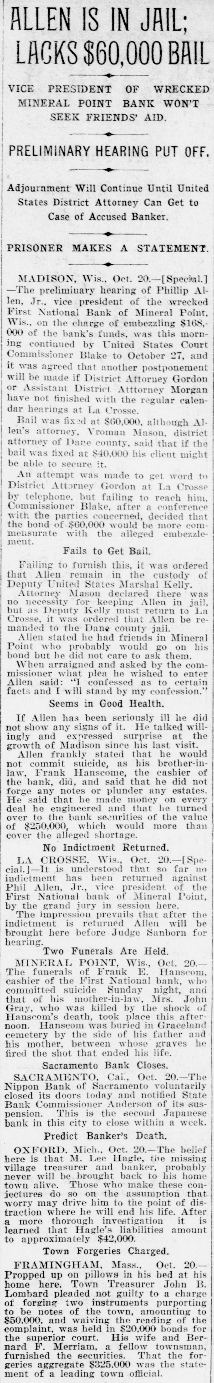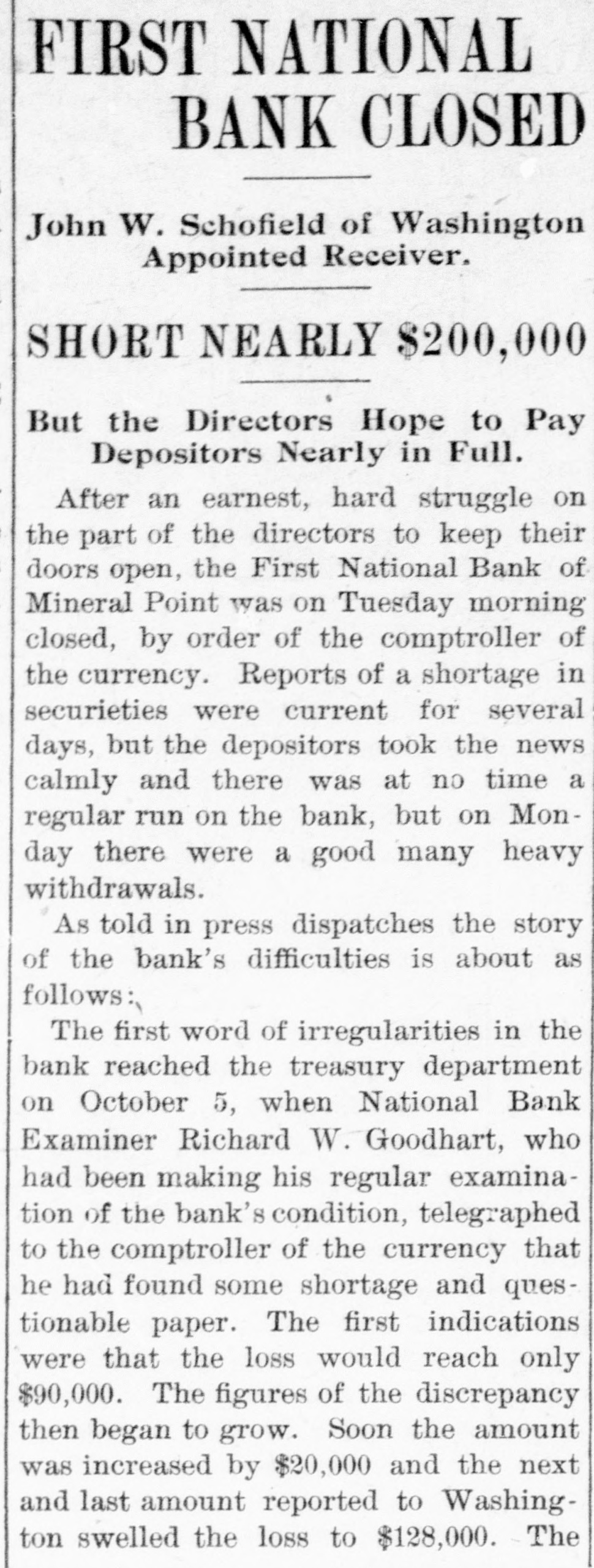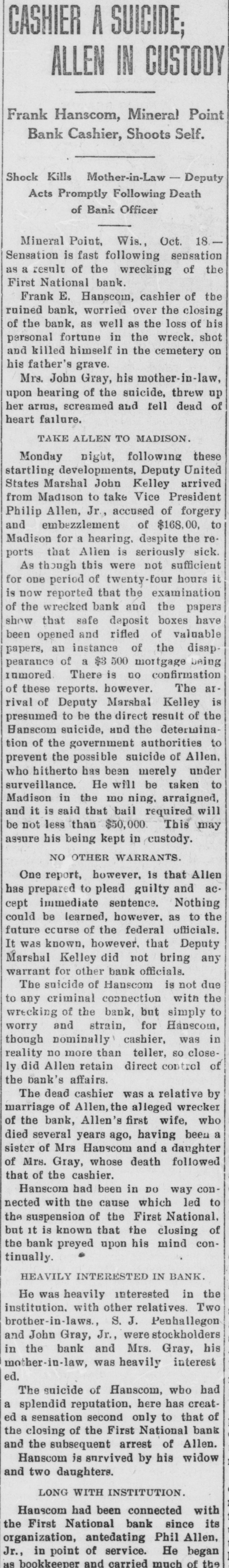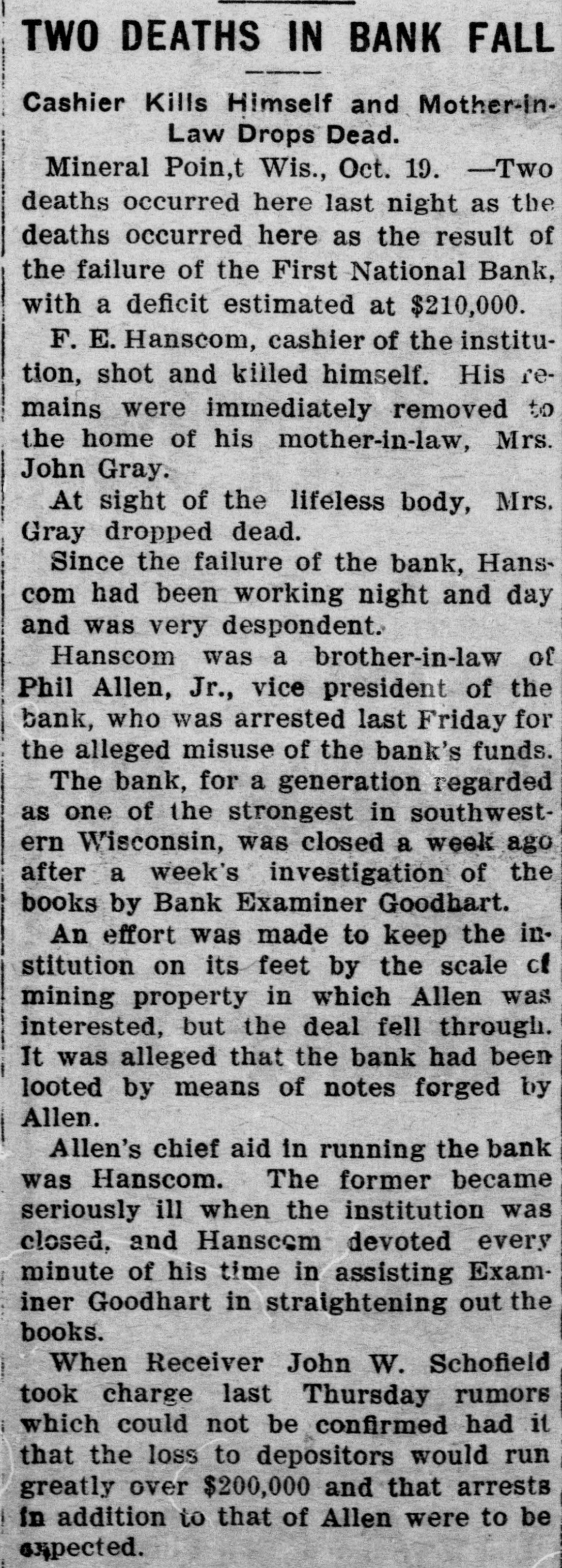 SHORTAGE CLOSES BANK ARRESTS ARE EXPECTED. Loss of $210,000 in Wisconsin Institution Said To Be Due to Forgery. Washington, Oct. 12.-The discovery of alleged forgeries and defalcations aggregating, according to unofficial advices, approximately $210,000 resulted in closing to-day the doors of the First National Bank of Mineral Point, Wis. John W. Schofield, of the office of the Controller of the Currency, was appointed receiver of the Wisconsin institution. Arrests are expected to follow the closing of the bank, after a conference between the federal authorities at Mineral Point. Word of irregularities in the bank reached the Treasury Department on October 5, when Richard W. Goodhart, national bank examiner, who had been making his regular examination of the bank's condition, telegraphed to the Controller of the Currency that he had found shortages and some questionable paper. The first indications were that the loss would reach only $90,000. The figures of the discrepancy then began to grow. Soon the amount was increased by $20,000, and the next and latest amount reported to Washington swelled the loss to $128,000. The losses on other paper in the bank subsequently discovered probably account for the difference between this amount and the $210,000 of alleged shortage announced in the press reports. S. Calvert Spensley, president of the bank, expressed to the examiner confidence in his ability to carry the bank through its troubles. The bank officials sought cash to place to the credit of the bank and succeeded in obtaining a small amount. Prestdent Spensley declared that he could raise $100,000 in cash within six days, but he was evidently unable to negotiate that amount on the bank's credit, and this morning Mr. Goodhart reported by telegraph that the bank had been closed. John W. Schofield, who was immediately appointed by Mr. Kane, Acting Controller of the Currency,, to take charge of the bank's affairs, left to-day for Mineral Point. He has acted as receiver for several banks. F. E. Hanscom is the bank's cashier. The directorate comprises President Spensley, Vice-Prestdent Philip Allen. jr., James Brewer, W. P. Gundey, Frederick Vivian, R. J. Penhalegon and J. L. Gray. The last statement of the resources and liabilities of the bank as shown by its report of condition rendered to the Controller on September 1, disclosed no unusual conditions on its face. The capital stock was $100,000, its surplus $20,000, and undivided profits $11,724. The bank had out $25,000 in circulation. secured by $51,393 in United States and other bonds. There was $505,978 in deposits and $5,000 of outstanding bills payable. This made total liabilities of $667,702. Of the same total amount of resources, all except the $51,393 of United States and other bonds are available for the debts of the institution. Besides the bonds, the resources comprised loans and discounts of $486,175 : banking house and other real estate, $37,458: amounts due from other banks, $48,206. and cash items, $44,470. Mineral Point., Wis., Oct. 12.-A more serious aspect developed in the failure of the First National Bank here to-day, it being reported that the shortage, instead of $200,000, as at first estimated. will run close to $400,000. Vice-President Phil Allen, jr., is said to have lost heavily in California and Montana mining investments. Worthless notes poured into the bank to-day, and widows and orphans were hard hit. as Mr. Allen acted as administrator of many estates. The value of the securities which he has turned over to the bank has not been ascertained, but much Western mining stock in the collection is said to be worthless. The bank examiner worked over the books until late to-night, practically completing his work, so that everything will be in readiness for the receiver. He was assisted by Cashier Harrison, a brotherin-law of Vice-President Allen. Mr. Allen, for years a victim of palsy, is seriously ill at his home, unable to see visitors. The city is noticeably quiet in the face of a calamity which affects a large proportion of the community. Mineral Point is the third oldest city in the state, and practically all of its three thousand inhabitants are of American birth. The bank was regarded as being thoroughly sound.