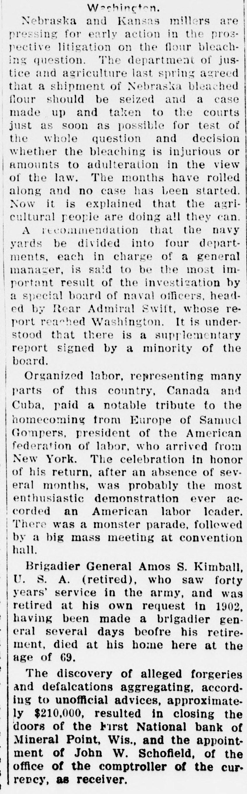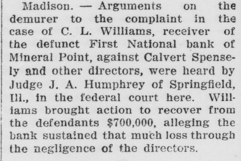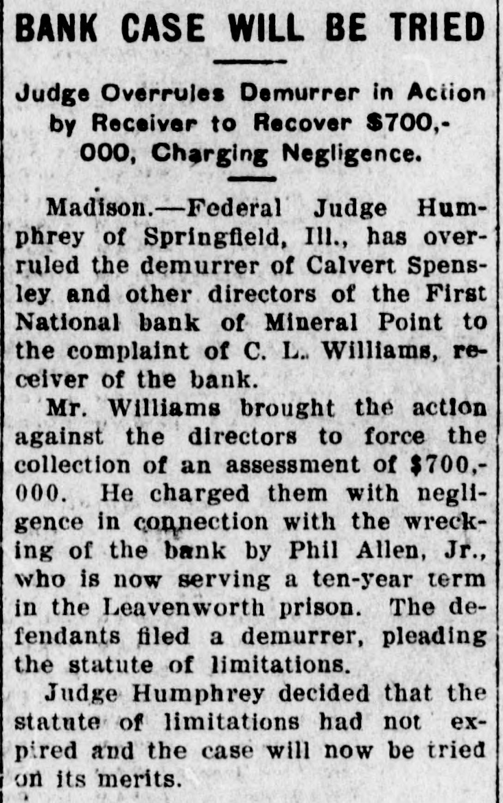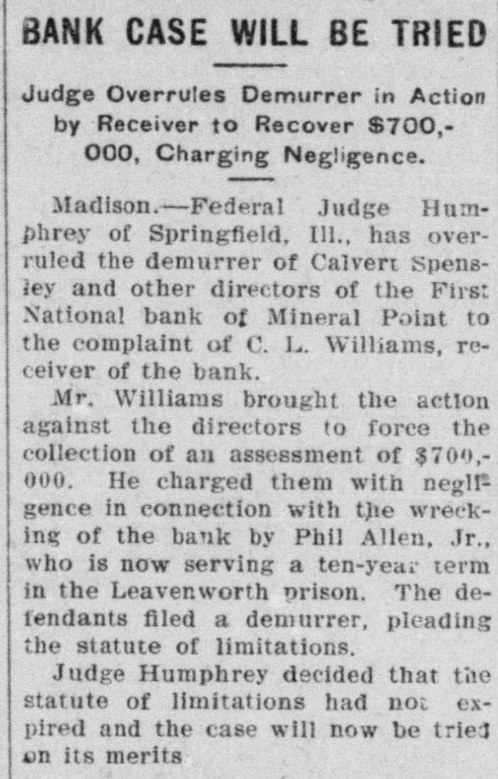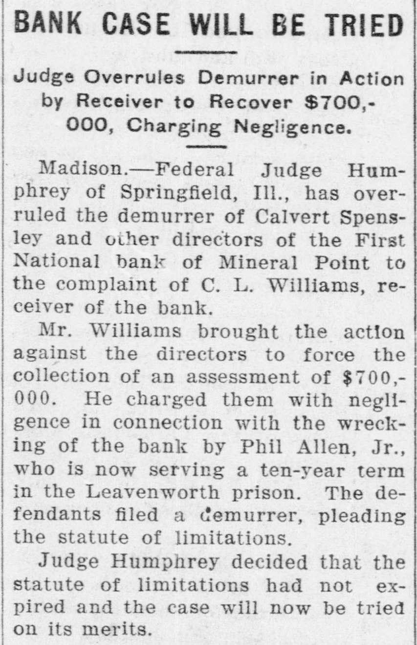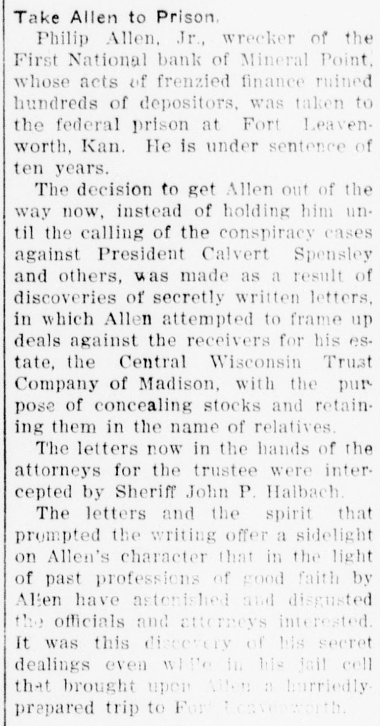 SHORTAGE CLOSES BANK ARRESTS ARE EXPECTED. Loss of $210,000 in Wisconsin Institution Said To Be Due to Forgery. Washington, Oct. 12.-The discovery of alleged forgeries and defalcations aggregating, according to unofficial advices, approximately $210,000 resulted in closing to-day the doors of the First National Bank of Mineral Point, Wis. John W. Schofield, of the office of the Controller of the Currency, was appointed receiver of the Wisconsin institution. Arrests are expected to follow the closing of the bank, after a conference between the federal authorities at Mineral Point. Word of irregularities in the bank reached the Treasury Department on October 5, when Richard W. Goodhart, national bank examiner, who had been making his regular examination of the bank's condition, telegraphed to the Controller of the Currency that he had found shortages and some questionable paper. The first indications were that the loss would reach only $90,000. The figures of the discrepancy then began to grow. Soon the amount was increased by $20,000, and the next and latest amount reported to Washington swelled the loss to $128,000. The losses on other paper in the bank subsequently discovered probably account for the difference between this amount and the $210,000 of alleged shortage announced in the press reports. S. Calvert Spensley, president of the bank, expressed to the examiner confidence in his ability to carry the bank through its troubles. The bank officials sought cash to place to the credit of the bank and succeeded in obtaining a small amount. Prestdent Spensley declared that he could raise $100,000 in cash within six days, but he was evidently unable to negotiate that amount on the bank's credit, and this morning Mr. Goodhart reported by telegraph that the bank had been closed. John W. Schofield, who was immediately appointed by Mr. Kane, Acting Controller of the Currency,, to take charge of the bank's affairs, left to-day for Mineral Point. He has acted as receiver for several banks. F. E. Hanscom is the bank's cashier. The directorate comprises President Spensley, Vice-Prestdent Philip Allen. jr., James Brewer, W. P. Gundey, Frederick Vivian, R. J. Penhalegon and J. L. Gray. The last statement of the resources and liabilities of the bank as shown by its report of condition rendered to the Controller on September 1, disclosed no unusual conditions on its face. The capital stock was $100,000, its surplus $20,000, and undivided profits $11,724. The bank had out $25,000 in circulation. secured by $51,393 in United States and other bonds. There was $505,978 in deposits and $5,000 of outstanding bills payable. This made total liabilities of $667,702. Of the same total amount of resources, all except the $51,393 of United States and other bonds are available for the debts of the institution. Besides the bonds, the resources comprised loans and discounts of $486,175 : banking house and other real estate, $37,458: amounts due from other banks, $48,206. and cash items, $44,470. Mineral Point., Wis., Oct. 12.-A more serious aspect developed in the failure of the First National Bank here to-day, it being reported that the shortage, instead of $200,000, as at first estimated. will run close to $400,000. Vice-President Phil Allen, jr., is said to have lost heavily in California and Montana mining investments. Worthless notes poured into the bank to-day, and widows and orphans were hard hit. as Mr. Allen acted as administrator of many estates. The value of the securities which he has turned over to the bank has not been ascertained, but much Western mining stock in the collection is said to be worthless. The bank examiner worked over the books until late to-night, practically completing his work, so that everything will be in readiness for the receiver. He was assisted by Cashier Harrison, a brotherin-law of Vice-President Allen. Mr. Allen, for years a victim of palsy, is seriously ill at his home, unable to see visitors. The city is noticeably quiet in the face of a calamity which affects a large proportion of the community. Mineral Point is the third oldest city in the state, and practically all of its three thousand inhabitants are of American birth. The bank was regarded as being thoroughly sound.