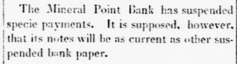 The Mineral Point Bank has suspended specie payments. It is supposed, however, that its notes will be as current as other suspended bank paper.