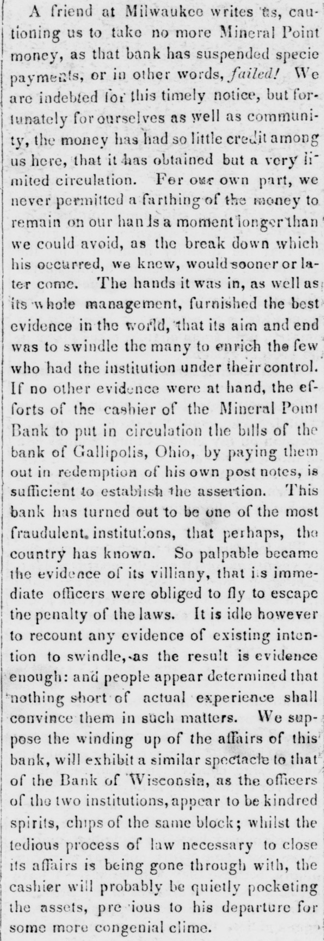 A friend at Milwaukee writes us, cautioning us to take no more Mineral Point money, as that bank has suspended specie payments, or in other words, failed! We are indebted for this timely notice, but fortunately for ourselves as well as community, the money has had SO little credit among us here, that it has obtained but a very iimited circulation. For our own part, we never permitted a farthing of the money to remain on our han Is a momentiongerthan we could avoid, as the break down which his occurred, we knew, would sooner or later come. The hands it was in, as well as its whole management, furnished the best evidence in the world, that its aim and end was to swindle the many to enrich the few who had the institution under their control. If no other evidence were at hand, the efforts of the cashier of the Mineral Point Bank to put in circulation the bills of the bank of Gallipolis, Ohio, by paying them out in redemption of his own post notes, is sufficient to establish the assertion. This bank has turned out to be one of the most fraudulent, institutions, that perhaps, the country has known. So palpable became the evidence of its villiany, that is immediate officers were obliged to fly to escape the penalty of the laws. It is idle however to recount any evidence of existing intention to swindle, as the result is evidence enough: and people appear determined that "nothing short of actual experience shall convince them in such matters. We suppose the winding up of the affairs of this bank, will exhibit a similar spectacle to that of the Bank of Wisconsia, as the officers of the two institutions, appear to be kindred spirits, chips of the same block; whilst the tedious process of law necessary to close its affairs is being gone through with, the cashier will probably be quietly pocketing the assets, pre ious to his departure for some more congenial clime.