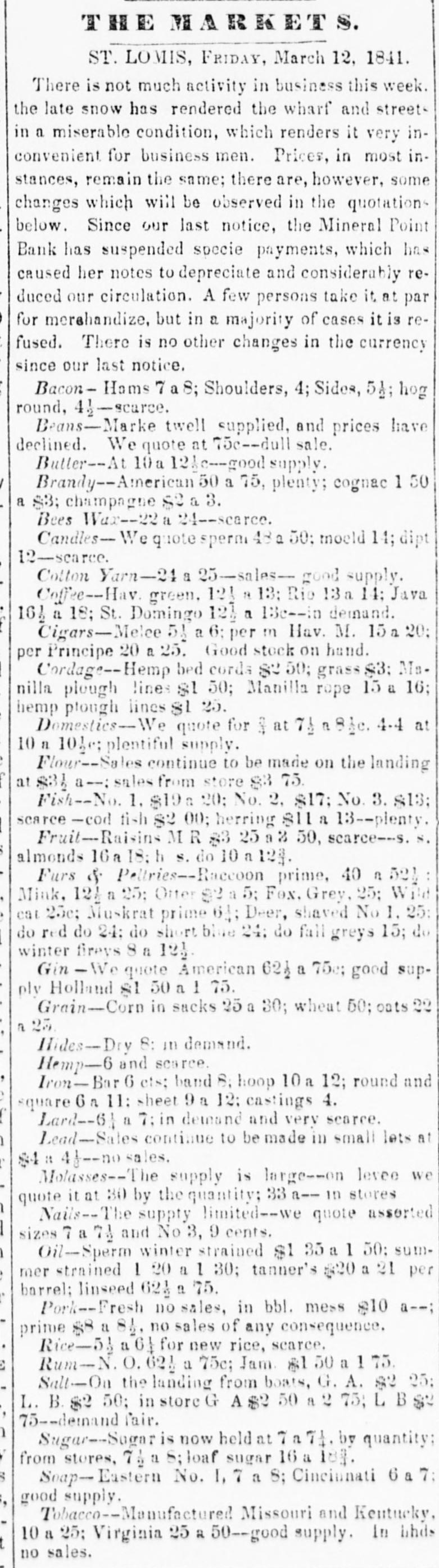 is T S. ST. LOMIS, FRIDAY, March 12, 1841. There is not much activity in business this week. the late snow has rendered the wharf and street in a miserable condition, which renders it very inconvenient for business men. Prices, in most in. stances, remain the same; there are, however, some changes which will be observed in the quotations below. Since our last notice, the Mineral Point Bank has suspended specie payments, which has caused her notes to depreciate and considerably reduced our circulation. A few persons take it at par for merahandize, but in a majority of cases it is refused. There is no other changes in the currency since our last notice. Bacon-Homs - 7 a 8; Shoulders, 4; Sides, 5A; hog round, 41-scarce. Beans-Marke twell supplied, and prices have declined. We quote at 75c--dull sale. Butter--At 10a 12Ac-good supply / Brandy--Americun 50 a 75, plenty; cognac 1 50 a S3; champagne $2 a 3. Bees Wax--22 a scarce. Candles- We quote sperm 48 a 50: moeld 14; dipt 12-scarce. Cotton Yarn-24 a 25-sales-- good supply. Coffee--Hav green. 121 a 13: Rio 13a 14; Java 164 a 18; St. Domingo 12) a 13c--in demand. Cigars-Melee 51 a 6: per m Hav. M. 15 a 20: per Principe 20 a 25. Good stock on hand. Cordage--Hemp bed cords SU 50; grass $3: Ms. nilla plough lines st 50; Manilla rope 15 a 16; hemp plough lines $1 25. Domestics--We quote for $ at 7.1 a 81c. 4.4 at 10 n 101c; plentiful supply. Flour-Sales continue to be made on the landing at $34 a--sales from store 83 75. Fish--No. 1. $19a 20; No. 2. $17; No. 3. S13; scarce-cod fish $2 00; herring 811 a 13--plenty. Fruit-Raisins MR 83 25 a 2 50, scarce--s. S. almonds 16a 18:h S. do 10 a 124 Furs & Pellries--Raccoon prime, 40 a 521 Mink. 12/ a 25: Otter Star 5; Fox. Grey, 25; Wild cat 25c; Muskrat prime 64; Deer, shaved No 1. 25: do red do 24: do short blue 24. do fall greys 15; do winter firevs 8 a 12} Gin - We quote American 621 a 75e; good supply Holland st 50 a 1 75. Grain-Corn in sucks 25 a 30; wheat 50; oats 22 a 23 Hides-Dry 8: in demand. Hemp-6 and scarce. Iron-Bar 6 ets; band 8, hoop 10a 12; round and s square 6 n 11: sheet 9a 12: castings 4. { Lard--61 a 7: in demand and very scarce. Lead-Sales continue to be made in small lets at ) $4 41--00 sales. l' Molasses--The supply is large--on levee we quote it at 30 by the quantity; 33 a-- in stores 1 Nails--The supply limited--we quote asserted I sizes 7 a 7A and No 3, 9 cents. ) Oil-Sperm winter strained $1 35 a 1 50: summer strained 1 20 a 1 30; tanner's $20 a 21 per ) barrel; linseed 621 a 75. : Pork--Fresh no sales, in bbl. mess $10 a--; prime $8 81. no sales of any consequence. . Rice-51 a 61 for new rice, scarce. E Rum-1 0.621 a 75c; Jam. 81 50 a 1 75. Salt-On the landing from boats, G. A. 92 25: L B. $2.50; in store G A $2.50 it 75; L B $2 , 75--demand fair. ) Sugar-Sugar is now held at 7: 71. by quantity; y from stores, 71 a S;loaf sugar 16 a 181. S Soap-Eastern No. I, 7 a S; Cincinnati 6 a 7: good supply. , Tobacco--Manufactured Missouri and Kentucky, 10 a 25; Virginia 25 2 50--good supply. In linds t no sales.