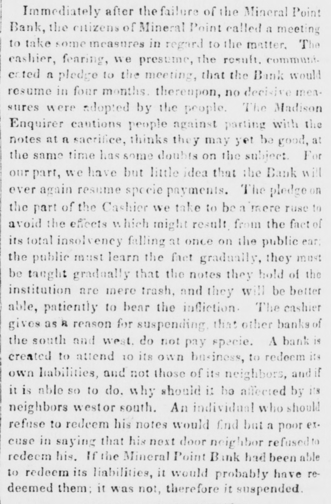 Immediately after the failure of the Mineral Point Bank, the citizens of Mineral Point called a meeting to take some measures in regard to the matter, The cashier, fearing, we presume, the result. communi. eated a pledge to the meeting, that the Bank would resume in four months thereupon, no decisive mensures were adopted by the people. The Madison Enquirer cautions people against parting with the notes at a sacrifice, thinks they may yet be good, at the same time has some doubts on the subject For our part, we have but little idea that the Bank will ever again resume specie payments. The pledge on the part of the Cashier we take to be a mere ruse to avoid the effects which might result from the fact of its total insolvency falling at once on the public ear; the public must learn the fact gradually, they must be taught gradually that the notes they hold of the institution are mere trash, and they will be better able, patiently to bear the infliction. The cashier gives as R reason for suspending that other banks of the south and west. do not pay specie. A bank is created to attend 10 its own business, to redeem its own liabilities, and not those of its neighbors, and if it is able so to do. why should it he affected by its neighbors westor south. An individual who should refuse to redeem his notes would find but a poor ex. cuse in saying that his next door neighbor refused to redeem his. If the Mineral Point Bank had been able to redeem its liabilities, it would probably have redeemed them; it was not, therefore it suspended.