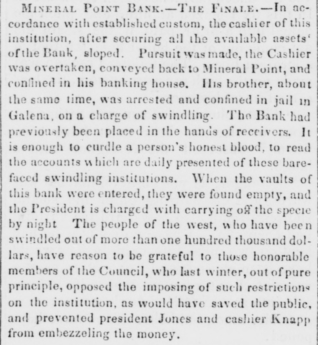 MINERAL POINT BANK.-Tr FINALE. - In accordance with established custom, the cashier of this institution, after securing all the available assets of the Bank, sloped. Pursuit was made, the Cashier was overtaken, conveyed back to Mineral Point, and confined in his banking house. His brother, about the same time, was arrested and confined in jail in Galena, on a charge of swindling. The Bank had previously been placed in the hands of receivers. It is enough to curdle a person's honest blood, to read the accounts W hich are daily presented of these barefaced swindling institutions. When the vaults of this bank were entered, they were found empty, and the President is charged with carrying off the specie by night The people of the west, who have been swindled out of more than one hundred thousand dollars, have reason to be grateful to those honorable members of the Council, who last winter, out of pure principle, opposed the imposing of such restrictions on the institution, as would have saved the public, and prevented president Jones and cashier Knapp from embezzeling the money.