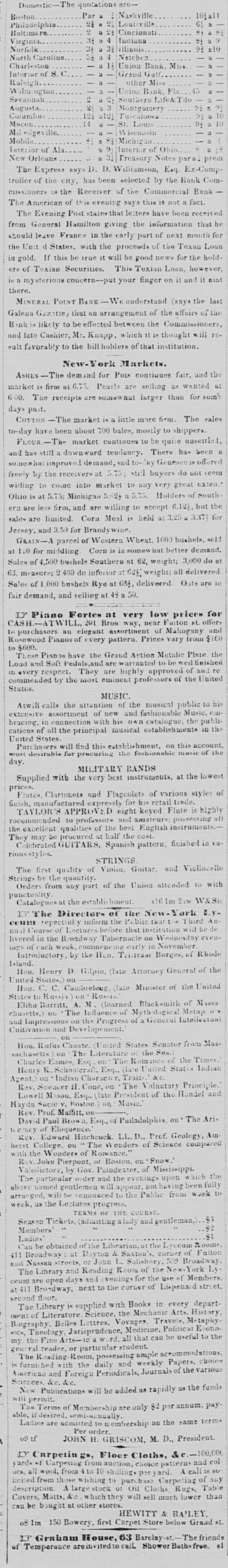Domestic The quotations are-Par Naskville 101 al Boston 23 21 Louisville Philadelphia Cincinnati Baltimore. 33 Indiana Virginia. Illinois 34 Norfulk Natchez 32 North Carolina Charleston 1 Union Bank, Miss Grand Gulf. Interior of S. other Miss Raleigh 45 Union Bank, Fla. Vilmington Savannah Southern Life& l'do 2. 91 Augusta. Montgomery 123 luscaloosa Columbu Macon. 14 St. Louis 9: Wisconsin Mikedgevill Mobile Michigan Interior of Ohio laterior of Ala New Orleans 31 Treasury Notes para. prem The Express says D. D. Williamson, Esq. Ex-Comptroller of the city, has been selected by the Bank Commissioners 28 the Receiver of the Commercial Bank The American of this evening says this is not fact. The Evening Post states that letters have been received from General Hamilton giving the information that he should leave France in the early part of next month for the Unit d States. with the proceeds of the Texau Loan in gold. If this be true it will be good news for the holdere of Texian Securities. This Texian Loan, however, is a mysterious concern--put your finger on it and it mist there. MINERAL POINT BANK -We understand (says the last Galena Gazatte, that an arrangement of the affairs of the Bankis likely to be effected between the Commissioners, re. and late Cashier, Mr. Knapp, which is thought will sult favorably to the bill holders of that institution. New-York Markets. ASHES - The demand for Pots contiques fair, and the market is firm at 6.75. Pearls are selling as wanted at e 00. The receipts are somew nat larger than for some days past. COTTON -The market is little more firm. The sales to-day have been about 700 bales, mostly to shippers. FLOUR.-The market continues to be quite unsettled, a and has still a downwar tendency. There has been somewhat improved demand, and to- BY Genesee is offered freely by the receivers at 5.75; still buyers do not seem willing to co.de into market to any very great extent Ohio is at 5.75: Michigan 5.623 a 5.75 Holders of south era are less firm, and are willing to accept 6.12}, but the sales are limited. Corn Meal is held at 3,25 . 3,371 for Jersey, and 3.50 for Brandy wine GRAIN--A parcel of Western Wheat. 1600 bushels, sold at 1.0 for middling Corn is in somew hat better demand. Sales of 4,500 bushels Southern at 62, weight; 3,000 do at 63. measure; 2 400 do inferior at 624 weight: all delivered Sales of 1.000 bushe!s Rye at 631, delivered Oats are in fair demand, and selling at 48 50. D Piano Fortes at very low prices for CASH-ATWILL 201 Bron way, near Fulton st. offers to purchasers an elegant assortment of Mahogany and Rosewood Pianos of every pattern. Prices vary from $160 to $600. These Pinnos have the Graud Action Metalic Plate the Loud and Soft Pedals.an are warranted to be weil finished in every respect. They are highly approved of and commended by the most emineut professors of the United States. MUSIC. Atwill calls the attention of the musical public to his extensive assortment of new and fashionable Music, einbracing, in connection with his own catalogue. the publications of all the principal musical establishments in the United States. Purchasers will find this extablishment, on this account, most desirable for precuring the fashionable music of the day. MILITARY BANDS Supplied with the very best instruments, at the lowest prices. Flutes, Clarionets and Flageolets of various styles of finish, manufactured expressly for his retail trade. TAYLOR'S APPROVED eight keyed Flute is hirthly racommended professors and amateurs; possessing all the excellent qualities of the best English instruments They may be procured half the cost. Celebrated GUITARS, Spanish pattern, finished in variousstyles. STRINGS The first quality of Viohn, Guitar, and Violincello the by quantity. Strings Orders from any part of the Union attended to with punctuality. <16 1m 2116 W&Sis Catalogues at the establishment IT The Directors of the New York Lyceun repectfully inform the Public that tie third Annual Course of Lectures before that institution will be de livered in the Broadway Tabernacle on Wednesday evenings of each week, commencing early in November Introductory, by the Hon. Tristrad Burges, of Rhode Island. Hon. Henry D. Gilpin, (late Attorney General of the United States.) Hon. C. C. Cambrelegg (late Minister of the United States to Rusin ) on Reside Eliha Barritt, A. M (learned Blacksmith of Massa chusetts.) on The Influence of Mythological Matap and Impressious on the Progress of General Intellectual Cultivation and Development. on Hon. Rufus Choate, United States Senator from Massachusetts on The Literature the Sea.) Charles Eames. Esq. on The Romance of the Times. Henry R Schooleraft, Esq., (late United States Indian Agent, on Indian Character, Traits. &c. Rev. Speacer H Cone, on The Voluntary Principle. Lowell Mason Esq., (late President of the Handel and aydu Socie v. Boston. on Music. Rev. Prof. Maffitt. on David Paul Brown. Esq., of Pailadelphia, on The Aris of Eloquence. teesay Rev. Edward Hitchcock LL.D., Prof. Geology, Amherst College. on The Wonders of Science compared with the Wonders of Romance." Rev.John Pierpont, of Boston, on Snow Valedictory, by Gov. Poindexter, of Mississippi. The particular order and the evenings upon which the above named geatlemen will appear, not having been fully arranged. will be announced to the Public from week to week, as the Lectures progress. TERMS OF THE COURSE. Season Tickets, (admitting alady and gentleman,) 83 82 Members SI Ladies' Can be obtained of the Librarian.ne the Lyceum Rooms. 411 Broadway at Dayton Saxton' corner of Fulton and Nassau streets, or John 1. Salisbur 509 Broadway The Library and Reading Room of the New-York Ly. ceum are open days and venings for the use of Members at 411 Broadway, next to the corner of Lispenard street, second floor. The Library is supplied with Books in every department of Literature Science, the Mechanic Arts. History Biography, Belles Lettres, Vovages, Travels. MetaphyNICS, Theol