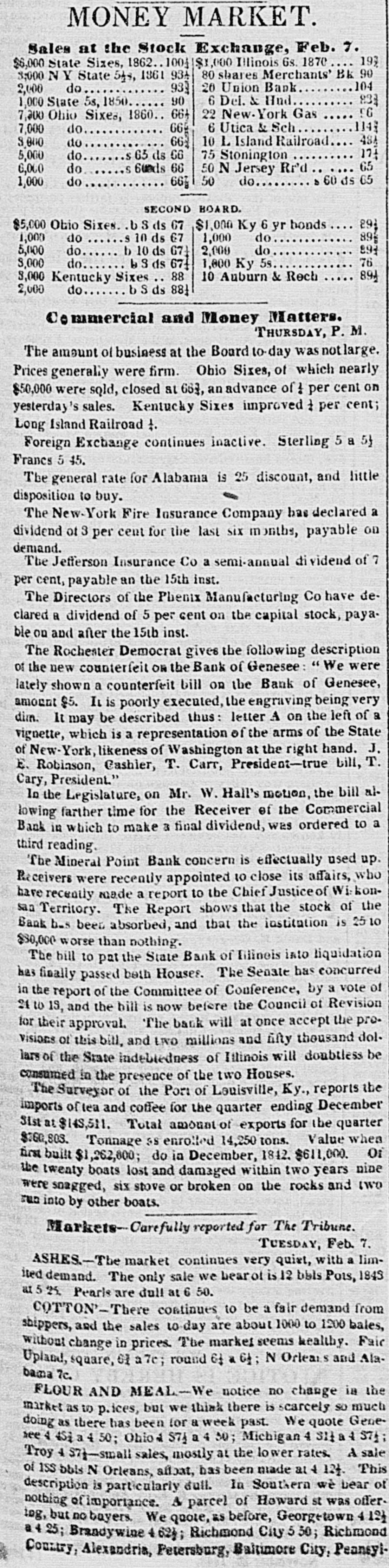 # Commercial and Money Matters. SATURDAY P. M. The transactions at the Brokers' Board were very limited to-day, but sales were generally firm. In State Stocks the sales were also small, but there was no change in prices. Foreign exchange is quiet-Sterling 5½ a 6; Francs, 5 45. Alabama is at 9 a 10 discount with very little doing. The Britannia at Boston brought $450,000 in specie. Another account states that she had nearly a million on board. Os the 27th inst. the assets of the Bank of Lyons will pass into the hands of the Receivers. The notes are selling at about 35 discount. There was more demand for Lewis Co. Bank Notes to day and buyers offered low rates, say 3 per cent: This may indicate resumption. The Atlantic Insurance Co. has declared a dividend of twenty-five per cent on the old stock. making 389 per cent since November 1829, averaging thirty per cent per annum. The new investment organization is going on prosperously. C. C. Palmer, Esq. has been appointed Secretary of the New York Life and Trust Co. in place of Ed. A. Nicoll. Jas. Smith, Cashier of the Marine and Fire Insurance Bank, Savannah, is a defaulter to the amount of twenty thousand dollars. The Bank is secure. The following Stocks sold at Boston: 0 shares Boston and Providence Railroad, $88 per share; 2 do Shoe and Leather Dealers' Bank, 93¼; 5 do Franklin Insurance Co. 92¼; 25 do South Cove, 84 a 85; 10 do Atlantic Bank, 82; 5 do Boston and Maine Railroad, 86½; 4 do Mechanics' Bank, 65; 5 certificates, each £2000, together $4800, Massachusetts 5 per cent stock, 1871. 87 a 87¼ per cent; 1000 N. Am. Trust a-d Banking Co. $12 00. The receipt of the Western Railroad last week were a little rising $7,300. The receipts from passengers have been smaller since the increase of fare. The Chatanque Co. and Silver Creek Banks are quarreling, and large amounts of specie have been drawn by the friends of the two Banks. At last the Silver Creek Bank being drawn on for $10.000 in specie declined forking over, pleading the lateness of the hour and in consequence the notes were protested. The Planters' and Merchants' Bank of Mobile has gone into immediate liquidation in conformity with a vote of the stockholders. A Convention of Merchants, Ship Owners, Ship-builders, and others in New England, interested in American mercantile Navigation, will be held on Tuesday next at Boston. This Convention will be held to take into consideration the past and present condition, and future prospects of the Mercantile Navigation of the United States; with especial reference to the commercial arrangements and treaties between the Government of the United States and Foreign Governments, and to adopt such measures in relation thereto, as the Convention may deem proper and expedient. Judgements to the amount of about $25,000 were obtained against the State Bank of Illinois at the November term o the Sangamon Circuit Court. A resolution has been introduced into the House of Representatives to ascertain upon what terms the Bank would give up the Bonds of the States held by it. A resolution was also offered in the Senate to rescind the proclamation of the Executive officers of the State, forbidding the reception of the paper of the Bank in payment of taxes. A meeting of note holders of the Mineral Point Bank was recently held at Platteville, and a committee appointed to obtain, from the Commissioners of the Bank, a full and fair statement of the causes which have delayed the application of the means in their hands to the payment of the bill holders. It was alleged that the Commissioners have had under their control, for nearly fifteen months, assets of the bank amounting to about $131,000-that they have not redeemed or canceled any of the bills or liabilities of said bank, or given any satisfactory explanation of their acts. The stockholders of the Planters' and Merchants' Bank, Mobile, held meetings on the 12th and 13th inst. at which resolutions were passed in favor of placing the institution in immediate liquidation, and turning its assets into means for the payment of its debts. A bill to regulate the Branch Bank at Mobile was introduced in the Legislature on the 8th instant. Among other provisions it contemplates revoking the powers to deal in bills of exchange, discount notes and receive money on deposit; requiring the different Branches and the Mother Bank, to receive the bills of the Branch 'in payment, and to stand as creditors of the Bank to get pay out of the assets; pledging the bonds to payment of the debts of the Bank equally, and authorizing a sale, with the concurrence of the Governor; authorizing debtors to the Bank to discharge their indebtedness with the notes of the Banks, and authorizing the issue of six per cent certificates to note holders. SATURDAY, Dec. 24. On the 14th. $237,424 in specie arrived at New Orleans from Tampico, of which 23,918 was for New-York. The house of Lizardi & Co. received $173,817. # Markets-Carefully reported for The Tribune. ASHES-There was nothing doing in either description as far as we could ascertain, and we believe there are no orders in market. Prime are firm at 5 75 a 6 00 for Pots, and 2 00 for Pearls. The quantity received and opening of navigation to 24th Dec. is 44,081 bbls. The exports are 31,549 Pots, 2879 Pearls. The stock is now, Pots, 1st sort 1287 bbls; 2d sort, 416 bbls; 3d sort, 227 bbls; condemned, 145 bbls-Total 2075. Pearls, 1st sort, 575; 2d sort, 100; 3d sort 28; condemned, 22-Total, 725 bbls. Compared with last week this is a diminution of 370 bbls Pots and 35 bbls Pearls. BEESWAX-We notice a sale of 3700 lbs Southern Yellow at 29 cents, cash. COTTON-The sales on Friday reached about 800 bales and to-day there were about 1500 bales; prices are firm but receivers offer Cotton freely at current prices. The sales of the week aggregate 8724 bales, of which 5703 bales were Upland and Florida at 5 a 7¾; 1550 Mobile, at 6 a 8½; 1200 New Orleans at 5 a 8¼. and 274 Texas on private te