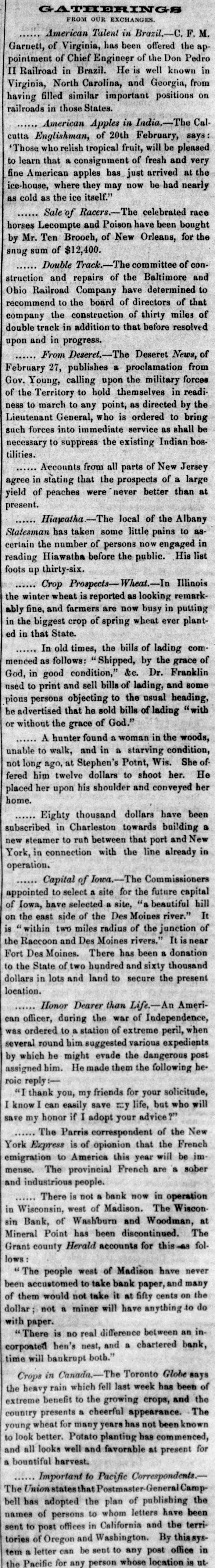 LATHERINGS FROM OUR EXCHANGES American Talent in Brazil. C.F. Garnett, of Virginia, has been offered the appointment of Chief Engineer of the Don Pedro II Railroad in Brazil. He is well known in Virginia, North Carolina, and Georgia, from having filled similar important positions on railroads in those States. American Apples in India.-T. cutta of 20th February, says: who relish tropical fruit, 'Those Englishman, fresh will be and pleased very to learn that a consignment of fine American apples has just arrived at the ice-house, where they may now be had nearly as cold as the ice itself." Sale of Racers.-The celebrated race horses Lecompte and Poison have been bought by Mr. Ten Brooch, of New Orleans, for the snug sum of $12,400. Double Track.-The committee of construction and repairs of the Baltimore and Ohio Railroad Company have determined to recommend to the board of directors of that company the construction of thirty miles of double track in addition to that before resolved upon and in progress. From Deseret.-The Deseret News, of 27, publishes a February proclamation military forces from Gov. Young, calling upon the of to hold themselves in readi to march to any point, as ness the Territory ordered directed by bring the Lieutenant General, who is to such forces into immediate service as shall be necessary to suppress the existing Indian hostilities. Accounts from all parts of New Jersey agree in stating that the prospects of a large yield of peaches were never better than at present. Hiapatha.-The local of the Albany Statesman has taken some little pains to ascertain the number of persons now engaged in reading Hiawatha before the public. His list foots up thirty-six. Crop Prospects-Wheat.--In Illinois the winter wheat is reported as looking remarkably fine, and farmers are now busy in putting in the biggest crop of spring wheat ever planted in that State. In old times, the bills of lading commenced as follows: Shipped, by of Dr. the Franklin grace God, in good condition," &e. used to print and sell bills of lading, and some pious persons objecting to the usual heading, he advertised that he sold bills of lading "with or without the grace of God." A hunter found a woman in the woods, unable to walk, and in a starving condition, not long ago, at Stephen's Potnt, Wis. She He of fered him twelve dollars to shoot her. placed her upon his shoulder and conveyed her home. Eighty thousand dollars have been subscribed in Charleston towards building a new steamer to run between that port and New York, in connection with the line already in operation. Capital of Iowa.-The Commissioners appointed to select a site for the future capital hill of Iowa, have selected a site, "a beautiful It on the east side of the Des Moines river." is "within two miles radius of the junction of the Raccoon and Des Moines rivers." It is near Fort Des Moines. There has been a donation to the State of two hundred and sixty thousand dollars in lots and land to secure the present location. Honor Dearer than Life.-An American officer, during the war of Independence, was ordered to a station of extreme peril, when several round him suggested various expedients by which he might evade the dangerous post assigned him. He made them the following heroic reply thank you, my friends for your solicitude, will I know I can easily save my life, but who save my honor if I adopt your advice?" The Parris correspondent of the New York Excress is of opionion that the French emigration to America this year will be im mense. The provincial French are a sober and industrious people. There is not a bank now in operation in Wisconsin, west of Madison. The Wiscon sin Bank, of Washburn and Woodman, at Mineral Point has been discontinued. The Grant county Herald accounts for this-as follows: The people west of Madison have never to take bank paper, many been them accustomed and of would not take it at fifty cents on the dollar not a miner will have anything to do with paper. There is no real difference between an incorpoated hen's nest, and a chartered bank, time will bankrupt both." Crops in Canada.- The Toronto Globe says the heavy rain which fell last week has been of extreme benefit to the growing crops, and the country presents a cheerful appearance. The young wheat for many years has not been known to look better. Potato planting has commenced, and all looks well and favorable at present for a bountiful harvest. Important to Pacific Correspondents. The Union states Postmaster-GeneralCamp bell has the plan of the of to whom letters names adopted persons publishing have the been sent to post offices in California and territories of Oregon and Washington. By this aystem a letter can be sent to any post office in the Pacific for any person whose location is ut-