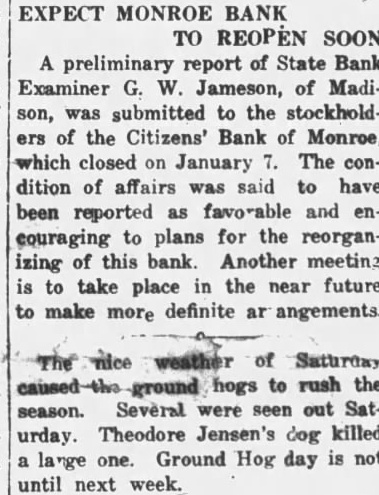 SCHOOLS TO PAY BYRD TRIBUTE Students to Send Greetings to Explorer. Des Moines school children will co-operate in a move to pay tribute to Rear Admiral Richard E. Byrd when he speaks before the department of superintendence at Detroit, J. W. Studebaker, superintendent of schools here, announced Wednesday. School children from every state will send letters of greeting to the/explorer. One letter will be sent from each school in Des Moines. The formulating of the letters will afford students an opportunity to study historic and scientific results of the polar explorations of Admiral Byrd. BANK SUSPENDS PAYMENT. The Tribune's Iowa News Service.) LAMOTTE-The Iowa Savings bank here suspended payment late Tuesd by order of the board of directors The bank is capitalized nt $40.000 and has deposits of $360,000. according to W M. Hayes vice president M Mahoney is president. Lamotte is in Jackson county. 2 WISCONSIN BANKS CLOSED. banks, the Citizens' Bank of Monroe. and the State Bank of Robcrts at Roberts, Wis. failed to open Wednesday, the state bank ing department announced. The Monroe bank had deposits of $1.363,000. while the Roberts institation amounted to $67,500. MYSTIC BANK CLOSED. MYSTIC. IA. (P)-The Mystic Industrial Savings bank closed Wednesday and was placed in the hands of receiver report to the state banking department last June showed deposits of $175,000.
