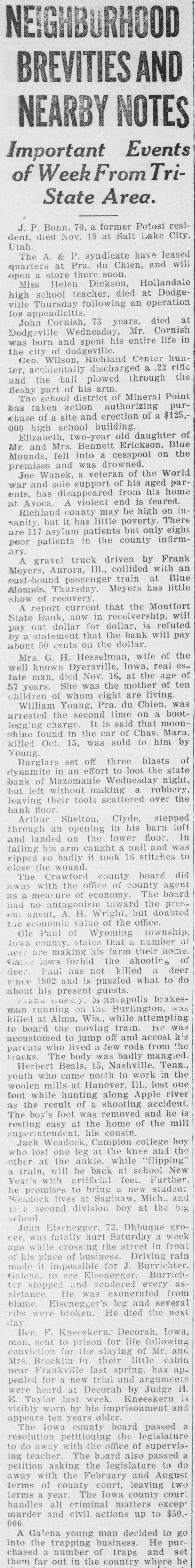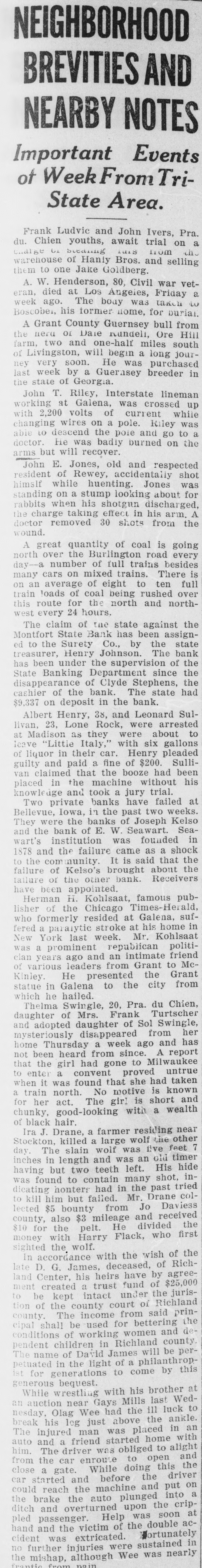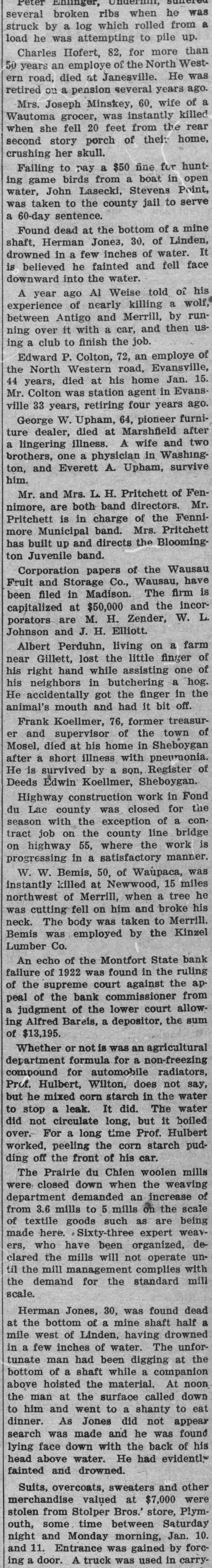several broken ribs when he was struck by a log which rolled from a load he was attempting to pile up. Charles Hofert, 82, for more than 50 years an employe of the North Western road, died at Janesville. He was retired on a pension several years ago. Mrs. Joseph Minskey, 60, wife of a Wautoma grocer, was instantly killed when she fell 20 feet from the rear second story porch of their home, crushing her skull. Failing to pay a $50 fine for hunting game birds from a boat in open water, John Lasecki, Stevens Point, was taken to the county jail to serve a 60-day sentence. Found dead at the bottom of a mine shaft, Herman Jones, 30, of Linden, drowned in a few inches of water. It is believed he fainted and fell face downward into the water. A year ago Al Weise told of his experience of nearly killing a wolf, between Antigo and Merrill, by running over it with a car, and then using a club to finish the job. Edward P. Colton, 72, an employe of the North Western road, Evansville, 44 years, died at his home Jan. 15. Mr. Colton was station agent in Evansville 33 years, retiring four years ago. George W. Upham, 64, pioneer furniture dealer, died at Marshfield after a lingering illness. A wife and two brothers, one a physician in Washington, and Everett A. Upham, survive him. Mr. and Mrs. L. H. Pritchett of Fennimore, are both band directors. Mr. Pritchett is in charge of the Fennimore Municipal band. Mrs. Pritchett has built up and directs the Bloomington Juvenile band. Corporation papers of the Wausau Fruit and Storage Co., Wausau, have been filed in Madison. The firm is capitalized at $50,000 and the incorporators are M. H. Zender, W. L. Johnson and J. H. Elliott. Albert Perduhn, living on a farm near Gillett, lost the little finger of his right hand while assisting one of his neighbors in butchering a hog. He accidentally got the finger in the animal's mouth and had it bit off. Frank Koellmer, 76, former treasurer and supervisor of the town of Mosel, died at his home in Sheboygan after a short illness with pneumonia. He is survived by a son, Register of Deeds Edwin Koellmer, Sheboygan. Highway construction work in Fond du Lac county was closed for the season with the exception of a contract job on the county line bridge on highway 55, where the work is progressing in a satisfactory manner. W. W. Bemis, 50, of Waupaca, was instantly killed at Newwood, 15 miles northwest of Merrill, when a tree he was cutting fell on him and broke his neck. The body was taken to Merrill. Bemis was employed by the Kinzel Lumber Co. An echo of the Montfort State bank failure of 1922 was found in the ruling of the supreme court against the appeal of the bank commissioner from a judgment of the lower court allowing Alfred Bareis, a depositor, the sum of $13,195. Whether or not is was an agricultural department formula for a non-freezing compound for automobile radiators, Prof. Hulbert, Wilton, does not say, but he mixed corn starch in the water to stop a leak. It did. The water did not circulate long, but it boiled over. For a long time Prof. Hulbert worked, peeling the corn starch pudding off the front of his car. The Prairie du Chien woolen mills were closed down when the weaving department demanded an increase of from 3.6 mills to 5 mills on the scale of textile goods such as are being made here. Sixty-three expert weavers, who have been organized, declared the mills will not operate until the mill management complies with the demand for the standard mill scale. Herman Jones, 30, was found dead at the bottom of a mine shaft half a mile west of Linden, having drowned in a few inches of water. The unfortunate man had been digging at the bottom of a shaft while a companion above hoisted the material. At noon the man at the surface called down to him and went to a shanty to eat dinner. As Jones did not appear search was made and he was found lying face down with the back of his head above water. He had evidently fainted and drowned. Suits, overcoats, sweaters and other merchandise valued at $7,000 were stolen from Stolper Bros.' store, Plymouth, some time between Saturday night and Monday morning, Jan. 10. and 11. Entrance was gained by forcing a door. A truck was used in carry-