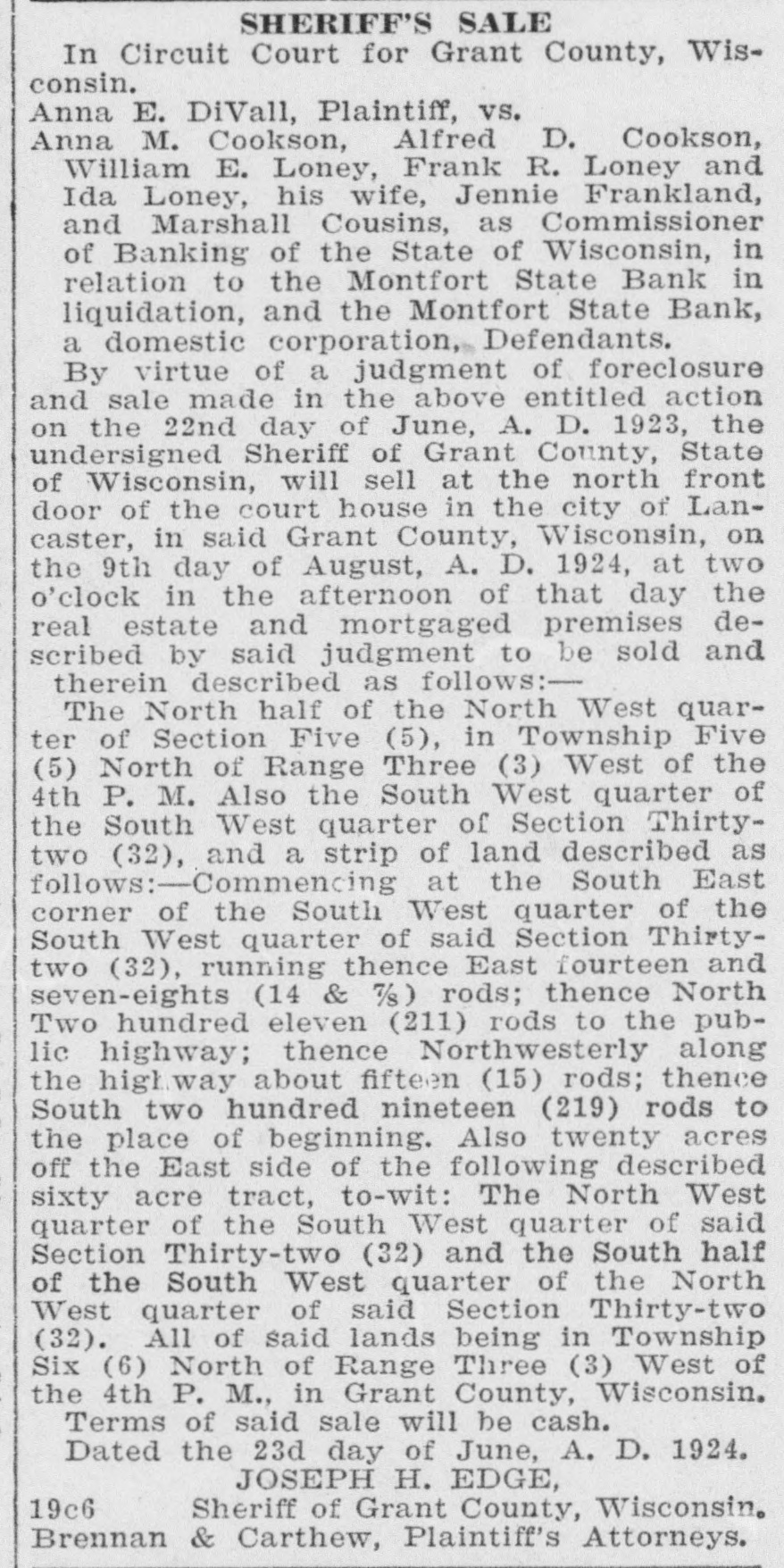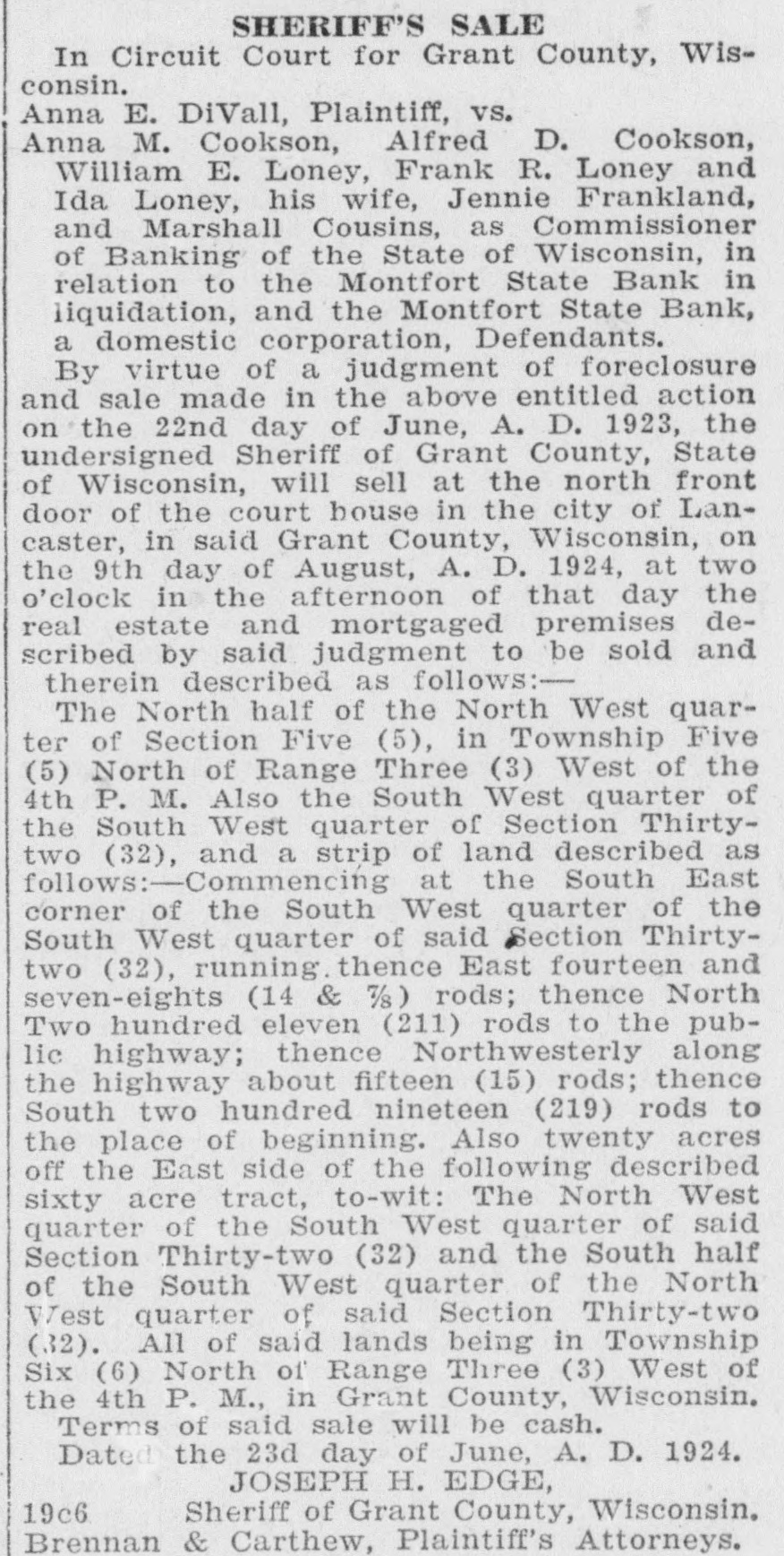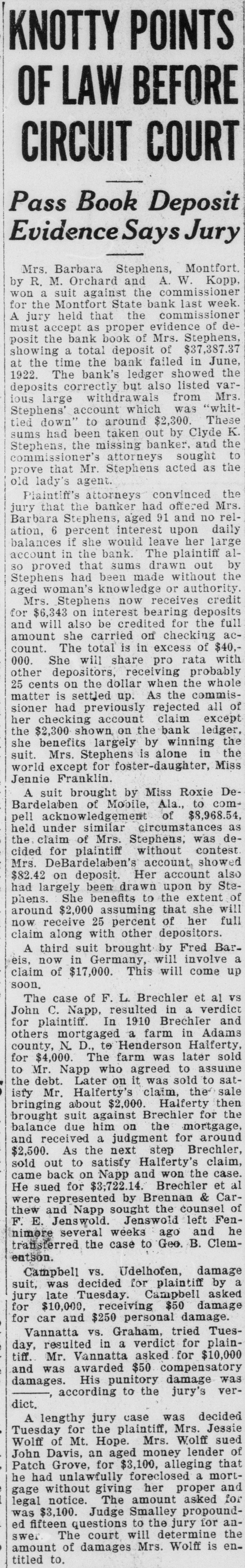 several broken ribs when he was struck by a log which rolled from a load he was attempting to pile up. Charles Hofert, 82, for more than 50 years an employe of the North Western road, died at Janesville. He was retired on a pension several years ago. Mrs. Joseph Minskey, 60, wife of a Wautoma grocer, was instantly killed when she fell 20 feet from the rear second story porch of their home, crushing her skull. Failing to pay a $50 fine for hunting game birds from a boat in open water, John Lasecki, Stevens Point, was taken to the county jail to serve a 60-day sentence. Found dead at the bottom of a mine shaft, Herman Jones, 30, of Linden, drowned in a few inches of water. It is believed he fainted and fell face downward into the water. A year ago Al Weise told of his experience of nearly killing a wolf, between Antigo and Merrill, by running over it with a car, and then using a club to finish the job. Edward P. Colton, 72, an employe of the North Western road, Evansville, 44 years, died at his home Jan. 15. Mr. Colton was station agent in Evansville 33 years, retiring four years ago. George W. Upham, 64, pioneer furniture dealer, died at Marshfield after a lingering illness. A wife and two brothers, one a physician in Washington, and Everett A. Upham, survive him. Mr. and Mrs. L. H. Pritchett of Fennimore, are both band directors. Mr. Pritchett is in charge of the Fennimore Municipal band. Mrs. Pritchett has built up and directs the Bloomington Juvenile band. Corporation papers of the Wausau Fruit and Storage Co., Wausau, have been filed in Madison. The firm is capitalized at $50,000 and the incorporators are M. H. Zender, W. L. Johnson and J. H. Elliott. Albert Perduhn, living on a farm near Gillett, lost the little finger of his right hand while assisting one of his neighbors in butchering a hog. He accidentally got the finger in the animal's mouth and had it bit off. Frank Koellmer, 76, former treasurer and supervisor of the town of Mosel, died at his home in Sheboygan after a short illness with pneumonia. He is survived by a son, Register of Deeds Edwin Koellmer, Sheboygan. Highway construction work in Fond du Lac county was closed for the season with the exception of a contract job on the county line bridge on highway 55, where the work is progressing in a satisfactory manner. W. W. Bemis, 50, of Waupaca, was instantly killed at Newwood, 15 miles northwest of Merrill, when a tree he was cutting fell on him and broke his neck. The body was taken to Merrill. Bemis was employed by the Kinzel Lumber Co. An echo of the Montfort State bank failure of 1922 was found in the ruling of the supreme court against the appeal of the bank commissioner from a judgment of the lower court allowing Alfred Bareis, a depositor, the sum of $13,195. Whether or not is was an agricultural department formula for a non-freezing compound for automobile radiators, Prof. Hulbert, Wilton, does not say, but he mixed corn starch in the water to stop a leak. It did. The water did not circulate long, but it boiled over. For a long time Prof. Hulbert worked, peeling the corn starch pudding off the front of his car. The Prairie du Chien woolen mills were closed down when the weaving department demanded an increase of from 3.6 mills to 5 mills on the scale of textile goods such as are being made here. Sixty-three expert weavers, who have been organized, declared the mills will not operate until the mill management complies with the demand for the standard mill scale. Herman Jones, 30, was found dead at the bottom of a mine shaft half a mile west of Linden, having drowned in a few inches of water. The unfortunate man had been digging at the bottom of a shaft while a companion above hoisted the material. At noon the man at the surface called down to him and went to a shanty to eat dinner. As Jones did not appear search was made and he was found lying face down with the back of his head above water. He had evidently fainted and drowned. Suits, overcoats, sweaters and other merchandise valued at $7,000 were stolen from Stolper Bros.' store, Plymouth, some time between Saturday night and Monday morning, Jan. 10. and 11. Entrance was gained by forcing a door. A truck was used in carry-
