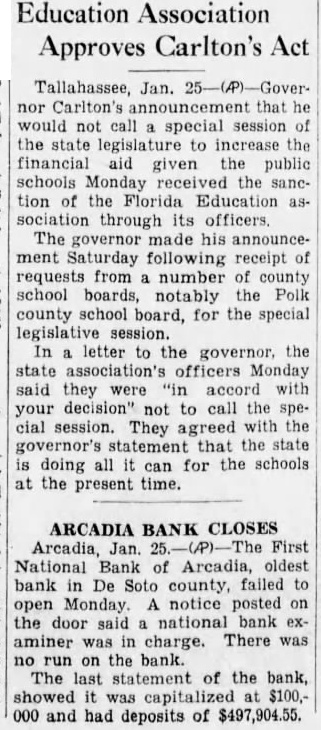ARCADIA, Jan. 25-After quiet withdrawals last week the First National bank here suspended today. The action was taken, It is understood, following failure of last minute negotiations to obtain assistance from the federal reserve bank at Atlanta. It was reported here Friday night that the bank had decided to close but after communicating with the federal reserve authorities at Atlanta it was finally decided to remain open pending negotiations to obtain additional federal reserve aid. In the meantime heavy withdrawals continued Saturday and after the closing hour the federal bank examiner was called in. He took charge this morning The bank was the oldest in DeSoto county and is operated by local people who have a substantial interest as stockholders and represent a majority on the board It was capitalized at $100,000 and the last statement showed deposits of $497,905.55.