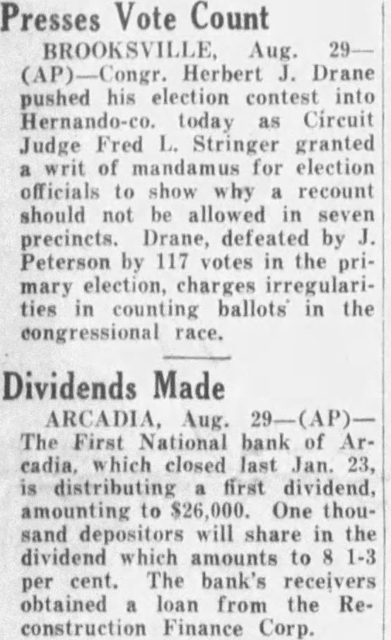 Aug. Herbert Drane pushed his election contest into Hernando-co. today Circuit Judge Fred Stringer granted of mandamus for election officials to show recount should not allowed seven precincts. Drane, defeated by Peterson 117 votes in the primary election, charges irregularities counting ballots' in the congressional race.