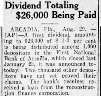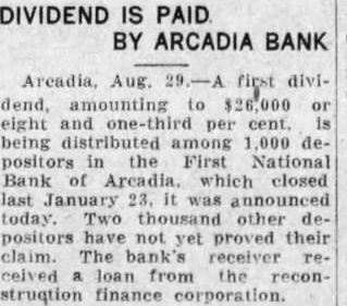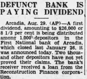 Arcadia Bank Pays $26,000 first dividend, to amounting $26,000 or cent being distributed per 1,000 among depositors in the First National Bank of Arcadia, which closed last Jan. 23, it was announced today. Two thousand other depositors have not yet proved their claims. The bank's receiver received loan from the Reconstruction ance corp.