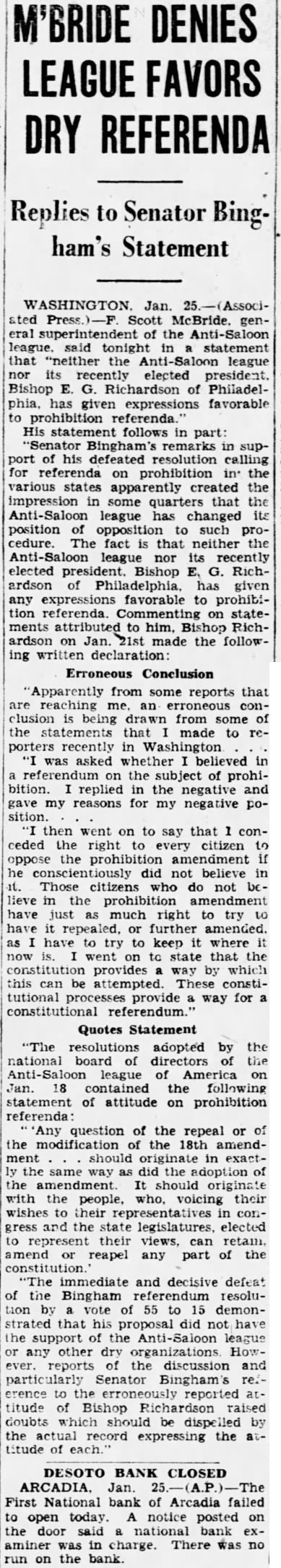 WASHINGTON Jan Scott McBride. general superintendent of the Anti-Saloon tonight statement that "neither the Anti-Saloon league recently elected president. Bishop E. Richardson of Philadelphia. has given expressions favorable prohibition referenda. His statement follows in part: "Senator Bingham's remarks support of his defeated resolution calling for referenda prohibition the various apparently created the impression some quarters that the league changed its position opposition to such procedure. The fact that neither the Anti-Saloon league its recently elected Bishop G. Richardson Philadelphia, has given any expressions favorable to prohibireferenda. Commenting on statements him. Richardson on Jan. made the following declaration: