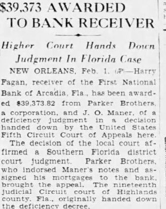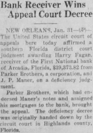Higher Court Hands Down Judgment In Florida Case NEW ORLEANS Feb Fagan, receiver of the First National Bank of Arcadia Fla. has been awarded $39,373.82 from Parker Brothers corporation. and O. Maner. of deficiency handed by the United States Fifth Circuit Court of Appeals here The decision of the local court af firmed Southern Florida district court judgment Parker Brothers who indorsed Maner's notes and assigned his mortgages to the bank brought the appeal The nineteenth judicial Circuit court of Highlands county. originally handed down the deficiency decree.