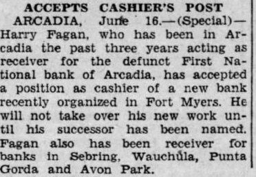 ACCEPTS CASHIER'S POST ARCADIA, Jurie (Special) Harry Fagan, who has been in Arcadia the past three years acting as receiver for the defunct First National bank of Arcadia, has accepted position as cashier of new bank recently organized in Fort Myers. He will not take over his new work until his has been named. Fagan also has been receiver for banks in Sebring Wauchula, Punta Gorda and Avon Park.