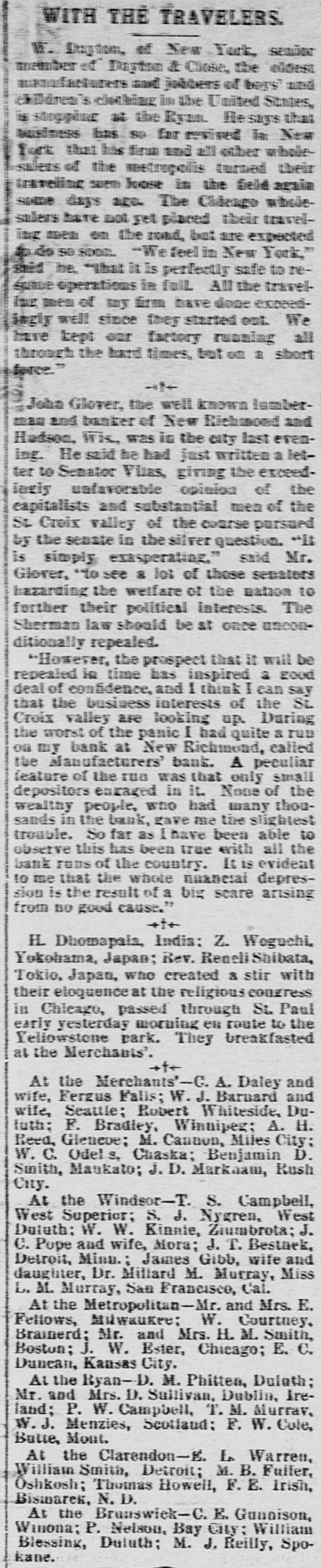 # WITH THE TRAVELERS. W. Dayton, of New York, senior member of Dayton & Close, the oldest manufacturers and jobbers of boys' and children's clothing in the United States, is stopping at the Ryan. He says that business has so far revived in New York that his firm and all other wholesalers of the metropolis turned their traveling men loose in the field again some days ago. The Chicago wholesalers have not yet placed their traveling men on the road, but are expected to do so soon. "We feel in New York," said he, "that it is perfectly safe to resume operations in full. All the traveling men of my firm have done exceedingly well since they started out. We have kept our factory running all through the hard times, but on a short force." John Glover, the well known lumberman and banker of New Richmond and Hudson, Wis., was in the city last evening. He said he had just written a letter to Senator Vilas, giving the exceedingly unfavorable opinion of the capitalists and substantial men of the St. Croix valley of the course pursued by the senate in the silver question. "It is simply exasperating," said Mr. Glover, "to see a lot of those senators hazarding the welfare of the nation to further their political interests. The Sherman law should be at once unconditionally repealed. "However, the prospect that it will be repealed in time has inspired a good deal of confidence, and I think I can say that the business interests of the St. Croix valley are looking up. During the worst of the panic I had quite a run on my bank at New Richmond, called the Manufacturers' bank. A peculiar feature of the run was that only small depositors engaged in it. None of the wealthy people, who had many thousands in the bank, gave me the slightest trouble. So far as I have been able to observe this has been true with all the bank runs of the country. It is evident to me that the whole financial depression is the result of a big scare arising from no good cause." H. Dhomapala, India; Z. Woguchi, Yokohama, Japan; Rev. Reneli Shibata, Tokio, Japan, who created a stir with their eloquence at the religious congress in Chicago, passed through St. Paul early yesterday morning en route to the Yellowstone park. They breakfasted at the Merchants'. At the Merchants'—C. A. Daley and wife, Fergus Falls; W. J. Barnard and wife, Seattle; Robert Whiteside, Duluth; F. Bradley, Winnipeg; A. H. Reed, Glencoe; M. Cannon, Miles City; W. C. Odell s, Chaska; Benjamin D. Smith, Maukato; J. D. Markaam, Rush City. At the Windsor—T. S. Campbell, West Superior; S. J. Nygren, West Duluth; W. W. Kinnie, Ziumbrota; J. C. Pope and wife, Mora; J. T. Bestnek, Detroit, Minu.; James Gibb, wife and daughter, Dr. Millard M. Murray, Miss L. M. Murray, San Francisco, Cal. At the Metropolitan—Mr. and Mrs. E. Fellows, Milwaukee; W. Courtney, Brainerd; Mr. and Mrs. H. M. Smith, Boston; J. W. Ester, Chicago; E. C. Duncan, Kansas City. At the Ryan—D. M. Phitten, Duluth; Mr. and Mrs. D. Sullivan, Dublin, Ireland; P. W. Campbell, T. M. Murray, W. J. Menzies, Scotland; F. W. Cole, Butte, Mont. At the Clarendon—E. L. Warren, William Smith, Detroit; M. B. Fuller, Oshkosh; Thomas Howell, F. E. Irish, Bismarck, N. D. At the Brunswick—C. E. Gunnison, Winona; P. Nelson, Bay City; William Blessing, Duluth; M. J. Reilly, Spokane.