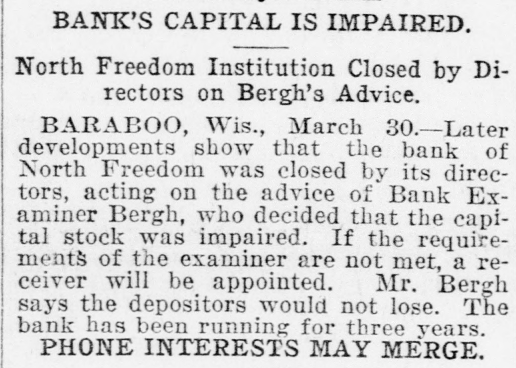 BANK'S CAPITAL IS IMPAIRED. North Freedom Institution Closed by Directors on Bergh's Advice. BARABOO, Wis., March 30.-Later developments show that the bank of North Freedom was closed by its directors, acting on the advice of Bank Examiner Bergh, who decided that the capital stock was impaired. If the requirements of the examiner are not met, a receiver will be appointed. Mr. Bergh says the depositors would not lose. The bank has been running for three years. PHONE INTERESTS MAY MERGE.