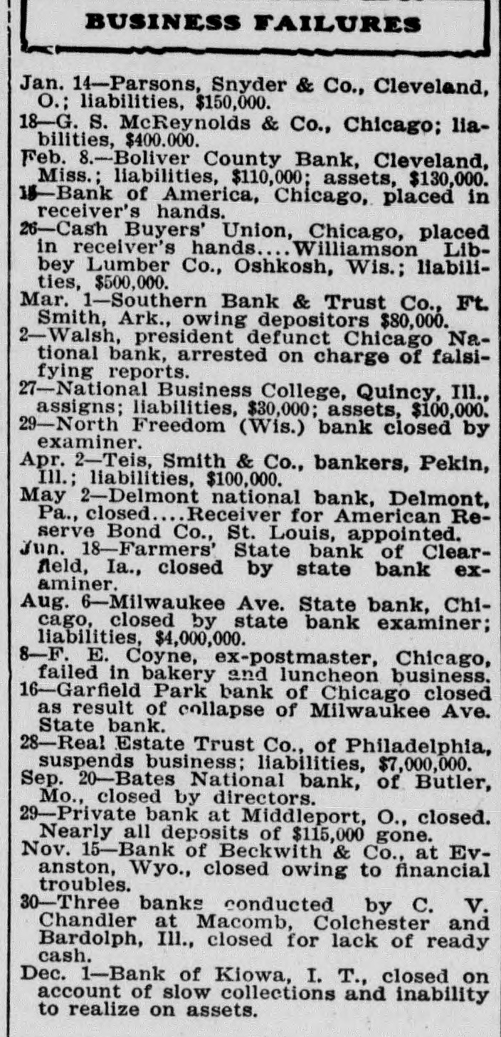 BUSINESS FAILURES Jan. 14-Parsons, Snyder & Co., Cleveland, O.; liabilities, $150,000. 18-G. S. McReynolds & Co., Chicago; liabilities, $400.000. Feb. 8.-Boliver County Bank, Cleveland, Miss.; liabilities, $110,000; assets, $130,000. 15-Bank of America, Chicago, placed in receiver's hands. 26-Cash Buyers' Union, Chicago, placed in receiver's hands Williamson Libbey Lumber Co., Oshkosh, Wis.; liabilities, $500,000. Mar. 1-Southern Bank & Trust Co., Ft. Smith, Ark., owing depositors $80,000. 2-Walsh,* president defunct Chicago National bank, arrested on charge of falsifying reports. 27-National Business College, Quincy, Ill., assigns; liabilities, $30,000; assets, $100,000. 29-North Freedom (Wis.) bank closed by examiner. Apr. 2-Teis, Smith & Co., bankers, Pekin, Ill.; liabilities, $100,000. May 2-Delmont national bank, Delmont, Pa., closed Receiver for American Reserve Bond Co., St. Louis, appointed. Jun. 18-Farmers' State bank of Clearfield, Ia., closed by state bank examiner. Aug. 6-Milwaukee Ave. State bank, Chicago, closed by state bank examiner; liabilities, $4,000,000. 8-F. E. Coyne, ex-postmaster, Chicago, failed in bakery and luncheon business. 16-Garfield Park bank of Chicago closed as result of collapse of Milwaukee Ave. State bank. 28-Real Estate Trust Co., of Philadelphia, suspends business; liabilities, $7,000,000. Sep. 20--Bates National bank, of Butler, Mo., closed by directors. 29-Private bank at Middleport, O., closed. Nearly all deposits of $115,000 gone. Nov. 15-Bank of Beckwith & Co., at Evanston, Wyo., closed owing to financial troubles. 30-Three banks conducted by C. V. Chandler at Macomb, Colchester and Bardolph, Ill., closed for lack of ready cash. Dec. 1-Bank of Kiowa, I. T., closed on account of slow collections and inability to realize on assets. 12-Farmers' and Drovers' National bank of Waynesburg, Pa., closed by comptroller of currency. 13-Cummings Commission Co., one of largest brokerage houses in northwest, suspends. 17-Lincoln bank of Morton Park, susurb of Chicago, fails.