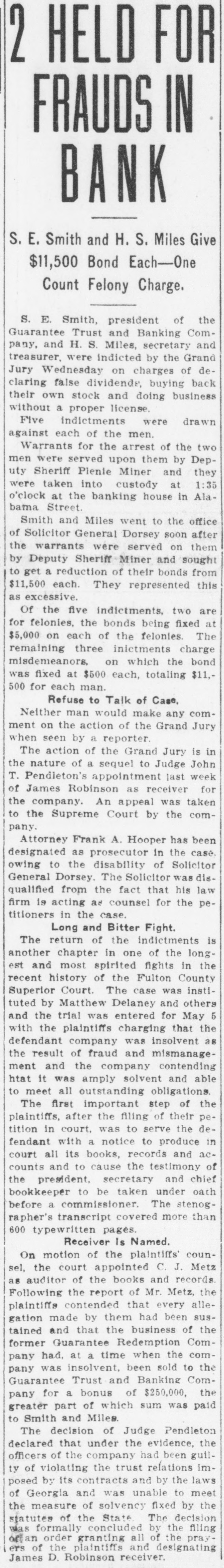 2 HELD FOR FRAUDS IN BANK S. E. Smith and H. S. Miles Give $11,500 Bond Each-One Count Felony Charge. S. E. Smith, president of the Guarantee Trust and Banking Company, and H. S. Miles, secretary and treasurer. were indicted by the Grand Jury Wednesday on charges of declaring false dividends, buying back their own stock and doing business without a proper license. Five indictments were drawn against each of the men. Warrants for the arrest of the two men were served upon them by Deputy Sheriff Plenie Miner and they were taken into custody at 1:35 o'clock at the banking house in Alabama Street. Smith and Miles went to the office of Solicitor General Dorsey soon after the warrants were served on them by Deputy Sheriff Miner and sought to get a reduction of their bonds from $11,500 each. They represented this as excessive. Of the five indictments, two are for felonies, the bonds being fixed at $5,000 on each of the felonies. The remaining three inictments charge misdemeanors, on which the bond was fixed at $500 each, totaling $11,500 for each man. Refuse to Talk of Case, Neither man would make any comment on the action of the Grand Jury when seen by a reporter. The action of the Grand Jury is in the nature of a sequel to Judge John T. Pendleton's appointment last week of James Robinson as receiver for the company. An appeal was taken to the Supreme Court by the company. Attorney Frank A. Hooper has been designated as prosecutor in the case. owing to the disability of Solicitor General Dorsey. The Solicitor was disqualified from the fact that his law firm is acting as counsel for the petitioners in the case. Long and Bitter Fight. The return of the indictments is another chapter in one of the longest and most spirited fights in the recent history of the Fulton County Superior Court. The case was instituted by Matthew Delaney and others and the trial was entered for May 5 with the plaintiffs charging that the defendant company was insolvent as the result of fraud and mismanagement and the company contending htat it was amply solvent and able to meet all outstanding obligations. The first important step of the plaintiffs, after the filing of their petition in court, was to serve the defendant with a notice to produce in court all its books, records and accounts and to cause the testimony of the president, secretary and chief bookkeeper to be taken under oath before a commissioner. The stenographer's transcript covered more than 600 typewritten pages. Receiver Is Named. On motion of the plaintiffs' counsel, the court appointed C. J. Metz as auditor of the books and records Following the report of Mr. Metz, the plaintiffs contended that every allegation made by them had been sustained and that the business of the former Guarantee Redemption Company had, at a time when the company was insolvent, been sold to the Guarantee Trust and Banking Company for a bonus of $250,000, the greater part of which sum was paid to Smith and Miles. The decision of Judge Pendleton declared that under the evidence, the officers of the company had been guilty of violating the trust relations imposed by its contracts and by the laws of Georgia and was unable to meet the measure of solvency fixed by the statutes of the State The decision was formally concluded by the filing organ order granting all of the prayers of the plaintiffs and designating James D. Robinson receiver.
