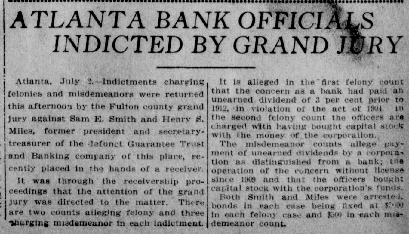 A TLANTA BANK OFFICIALS INDICTED BY GRAND JURY Atlanta, July 2.-Indietments charging It is alleged in the first felony count that the concern as a bank had paid an felonies and misdemeanors were returned unearned dividend of 3 per cent prior to this afternoon by the Fulton county grand 1912, in violation of the act of 1904. in the second felony count the officers are jury against Sam E. Smith and Henry IS. charged with having bought capital stock Miles, former president and secretarywith the money of the corporation. treasurer of the defunct Guarantee Trust The misdemeanor counts allege payment of unearned dividends by a corporaand Banking company of this place, retion as distinguished from a bank; the cently placed in the hands of a receiver. operation of the concern without license since 1909 and that the officers bought It was through the receivership procapital stock with the corporation's funds. ceedings that the attention of the grand Both Smith and Miles were arrested, jury was directed to the matter. There bonds in each case being fixed at $2000 are two counts alleging felony and three in each felony case and $500 in each misdemeanor count. charging misdemeanor in each indictment.