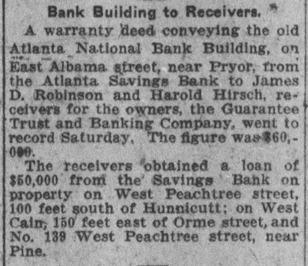 Bank Building to Receivers. A warranty deed conveying the old Atlanta National Bank Building ... from the Atlanta Savings Bank to James D. Robinson and Harold Hirsch, receivers for the owners, the Guarantee Trust and Banking Company, went to record Saturday, The figure was $60,000. The receivers obtained a loan of $50,000 ... (March 28, 1914).