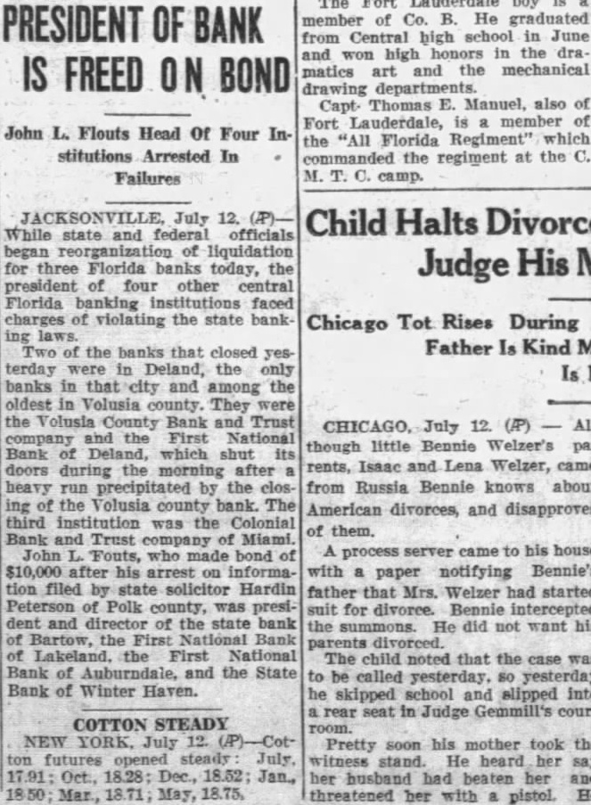 PRESIDENT OF BANK IS FREED John L. Flouts Head Of Four Institutions Arrested In Failures July 12. state and officials began of liquidation for three Florida banks today, the president of four other central Florida faced charges violating the state banklaws. of the banks that closed yesterday were in Deland, the only banks in and among the oldest in Volusia county. They the Volusia County Bank and Trust CHICAGO, July company the First National though little Bennie Welzer's paBank Deland, which its rents, Isaac and Lena Welzer, came doors during after heavy run precipitated by the from Russia Bennie knows about the Volusia county bank. The American divorces, and disapproves third institution was the Colonial them. Trust company Miami. process server came his house John Fouts, made bond $10,000 after his arrest informa- with paper notifying Bennie's tion filed state solicitor Hardin father that Mrs. Welzer had started Peterson Polk county, was presi- suit for Bennie dent director of the bank the did want his not Bartow, the First National Bank parents divorced. First National The child noted that the case was Bank of Auburndale, and the State be called yesterday. yesterday Bank of Winter Haven. skipped school and slipped into COTTON STEADY NEW YORK, July Pretty soon his mother the futures opened steady July, witness He heard her Oct., her husband had beaten her threatened her with