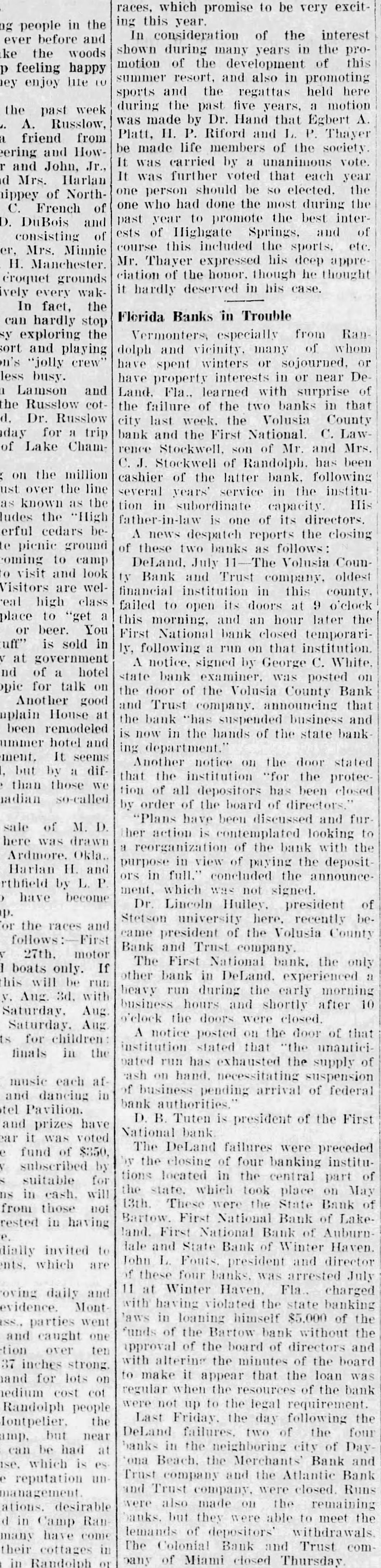 races, which promise to be very excitthis year In consideration of the interest shown during many years in the motion of the development of this summer resort, and also in promoting sports and the regattas held here during the past five years, motion was made by Dr. Hand that Egbert Platt, H. Riford and Thayer be made life members of the society It was carried by unanimous vote. was further voted that each year person should be elected. the one who had done the most during the past to promote the best interof Highgate Springs, and of course this included sports, etc. Mr. Thayer expressed his deep appreciation the honor. though he thought it hardly deserved in his case. Florida Banks in Trouble especially from Ran dolph and vicinity. many have spent winters or sojourned. have property interests in near De Land. Fla., learned with surprise of the failure of the two banks in that city last week. the Volusia County bank and the First National. Law rence Stockwell, of Mr. and Mrs. Stockwell of Randolph. has been cashier of the latter bank. following several years service in the institu tion subordinate capacity His of its directors. news despatch reports the closing these two banks follows: DeLand, July Volusia CounBank and Trust company. oldest financial institution in this county, failed open its doors at o'clock this morning. and an hour later the First National bank closed temporari ly, run on that institution notice. signed by George White state bank examiner. was posted the door the Volusia County Bank and Trust company. announcing that the suspended business and is now in the hands of the state bank ing Another notice on the door stated that the institution the protec tion of all depositors has been closed by order of the board of directors Plans been discussed and fur action contemplated looking of the bank with the purpose in view the deposit in full. concluded the announcement. which not signed. Dr. Lincoln Hulley. president of Stetson university here recently bepresident the Volusia County Bank and Trust company. The First National bank. the only other bank in DeLand. experienced heavy run during the morning business hours and shortly after 10 o'elock the doors were closed. notice posted the door of that institution stated that the unantici oated run has exhausted the supply of ash on hand. necessitating business pending arrival of federal bank B Tuten is president of the First National bank The DeLand failures were preceded the closing of four banking institu tions located in the central part of the which took place May 13th These State Bank of Bartow. First National Bank of Lakeland. First National Bank of Auburn and State Bank of Haven John Fouts president and director these four banks, arrested July 11 Winter Haven. charged with violated the banking 'aws in loaning himself $5,000 of the funds of the Bartow bank without the approval of the board of directors and with altering the minutes of the board make appear that the loan was regular the resources of the bank up to the legal requirement. Last Friday. the day following the DeLand failures. two of the four the neighboring city of Day Beach. the Merchants' Bank and Trust company and the Atlantic Bank and company. closed. Runs made the remaining sanks but they were able to meet the lemands depositors withdrawals The Colonial Bank and Trust bany Miami closed Thursday