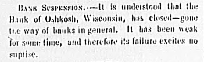 It is understood that the Bank of Oshkosh, Wisconsin, has closed-gone ... It has been weak for some time, and therefore its failure excites no suprise.