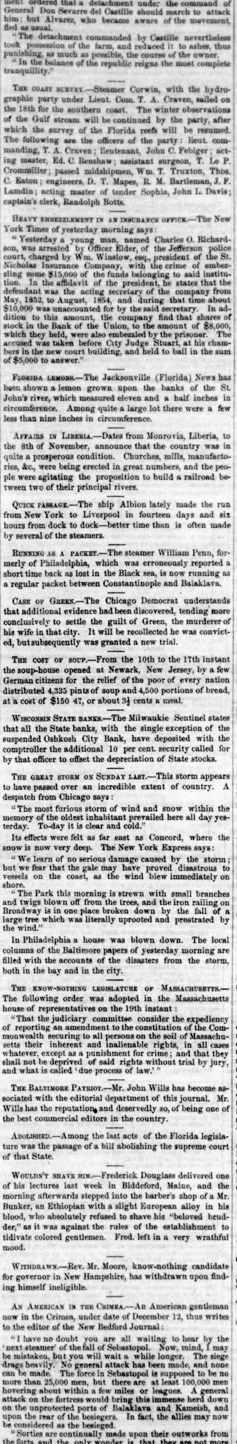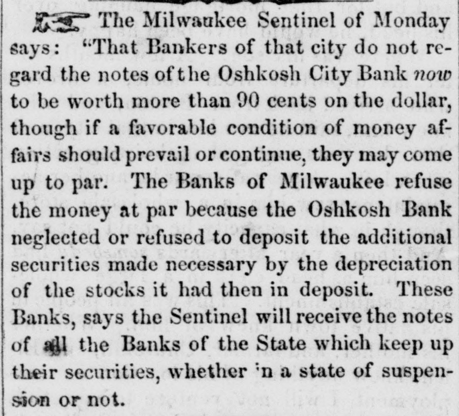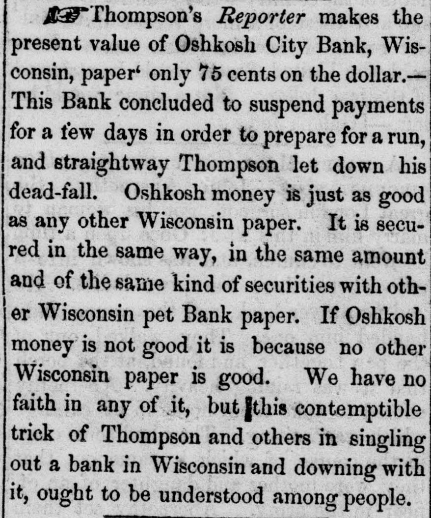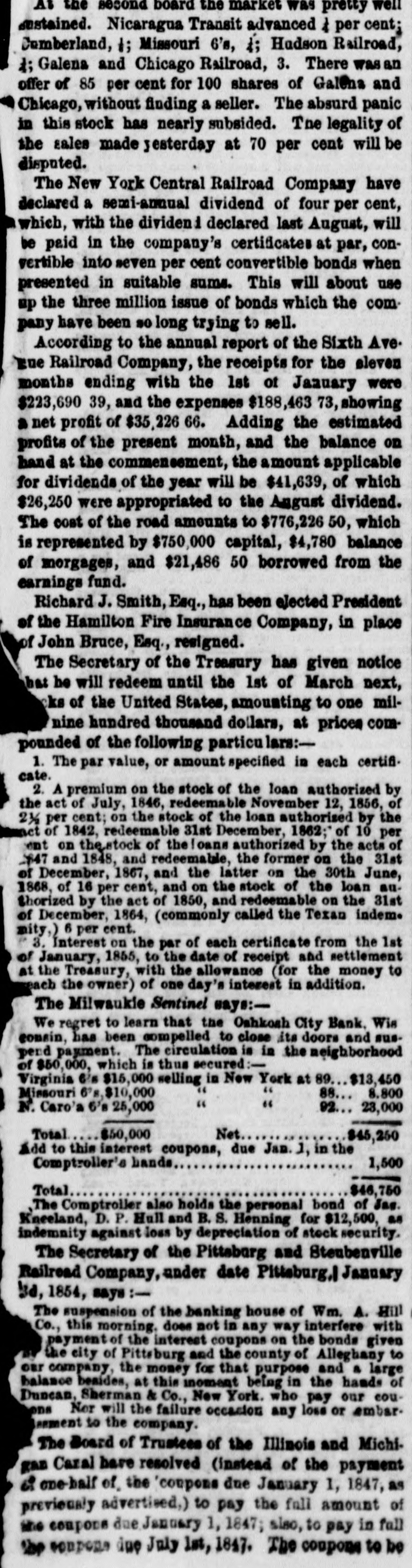 At the second board the market was pretty well sustained. Nicaragua Transit advanced & per cent; Comberland, #; Missouri 6's, 4; Hudson Railroad, #; Galena and Chicago Railroad, 3. There was an offer of 85 per cent for 100 shares of Galena and Chicago, without finding a seller. The absurd panic in this stock has nearly subsided. The legality of the sales made yesterday at 70 per cent will be disputed. The New York Central Railroad Company have declared a semi-annual dividend of four per cent, which, with the dividen 1 declared last August, will be paid in the company's certificates at par, convertible into seven per cent convertible bonds when presented in suitable sums. This will about use up the three million issue of bonds which the company have been so long trying to sell. According to the annual report of the Sixth Ave. Eue Railroad Company, the receipts for the sleven months ending with the 1st of January were $223,690 39, and the expenses $188,463 73, showing a net profit of $35,226 66. Adding the estimated profits of the present month, and the balance on hand at the commensement, the amount applicable for dividends of the year will be $41,639, of which $26,250 were appropriated to the August dividend. The cost of the road amounts to $776,226 50, which is represented by $750,000 capital, $4,780 balance of morgages, and $21,486 50 borrowed from the earnings fund. Richard J. Smith, Esq., has been elected President of the Hamilton Fire Insurance Company, in place of John Bruce, Esq., resigned. The Secretary of the Treasury has given notice hat be will redeem until the 1st of March next, ks of the United States, amounting to one milnine hundred thousand dollars, at prices compounded of the following particu lars:1. The par value, or amount specified in each certificate. 2. A premium on the stock of the loan authorized by the act of July, 1846, redeemable November 12, 1856, of 2½ per cent; on the stock of the loan authorised by the of 1842, redeemable 31st December, 1862; of 10 per ent on the stock of the !oans authorized by the acts of 2847 and 1848, and redeemable, the former on the 31st of December, 1867, and the latter on the 30th June, 1868, of 16 per cent, and on the stock of the loan authorized by the act of 1850, and redeemable on the 31st of December, 1864, (commonly called the Texan indem. mity,) 6 per cent. 3. Interest on the par of each certificate from the 1st of January, 1855, to the date of receipt and settlement at the Treasury, with the allowance (for the money to each the owner) of one day's interest in addition. The Milwaukie Sentinel says:We regret to learn that the Oshkosh City Bank. Wis consin, has been compelled to close its doors and suspend payment. The circulation is in the neighborhood of $50,000, which is thus secured:Virginia 6's $15,000 selling in New York at 89. $13,450 " " 88 Missouri 6's,$10,000 8,800 " " 92 23,000 N. Caro'a 6's 25,000 Net Total $50,000 $45,250 Add to this interest coupons, due Jan. 1, in the 1,500 Comptroller's hands Total $46,750 The Comptroller also holds the personal bond of Jan. Kneeland, D. P. Hull and B. S. Henning for $12,500, as indemnity against loss by depreciation of stock security. The Secretary of the Pittsburg and Steubenville Railroad Company, under date Pittsburg,I January 3d, 1854, says :The suspension of the banking house of Wm. A. Hill Co., this morning. does not in any way interfere with payment of the interest coupons on the bonds given the city of Pittsburg and the county of Alleghany to our company, the money for that purpose and a large balance besides, at this moment being in the hands of Duncan, Sherman & Co., New York. who pay our couons Nor will the failure occasion any loss or embarsement to the company. The Board of Trustees of the Illinois and Michigan Caral have resolved (instead of the payment is one-half of, the 'coupons due January 1, 1847, as previously advertised,) to pay the full amount of the coupons due January 1, 1847; siso, to pay in full the coupons due July 1st, 1847. The coupons to be