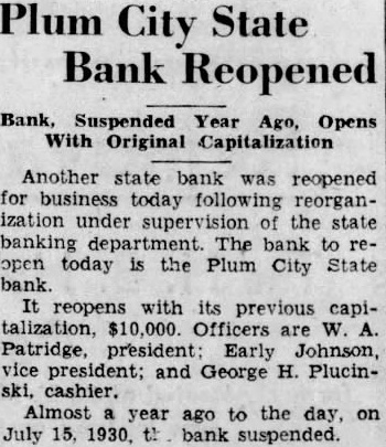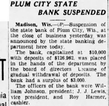 PLUM CITY STATE BANK SUSPENDED Madison, the state bank of Plum City, the close of business yesterday announced by the banking partment here today The bank, capitalized $10,000 deposits placed in hands of the department the directors Lecause gradual withdrawal deposits. The bank had surplus $3.000 The officers the bank William Johnson. president: Lewis. vice and Roy Harmer, cashier.