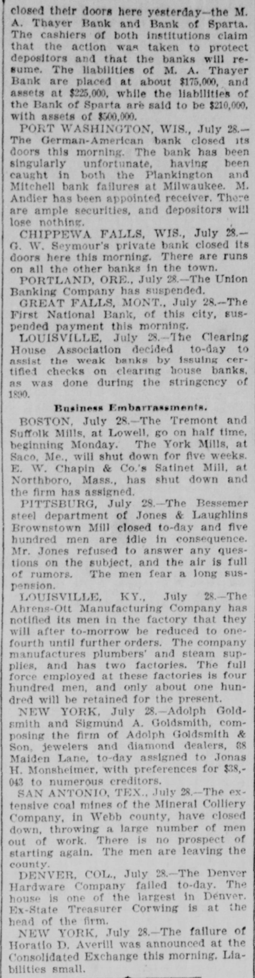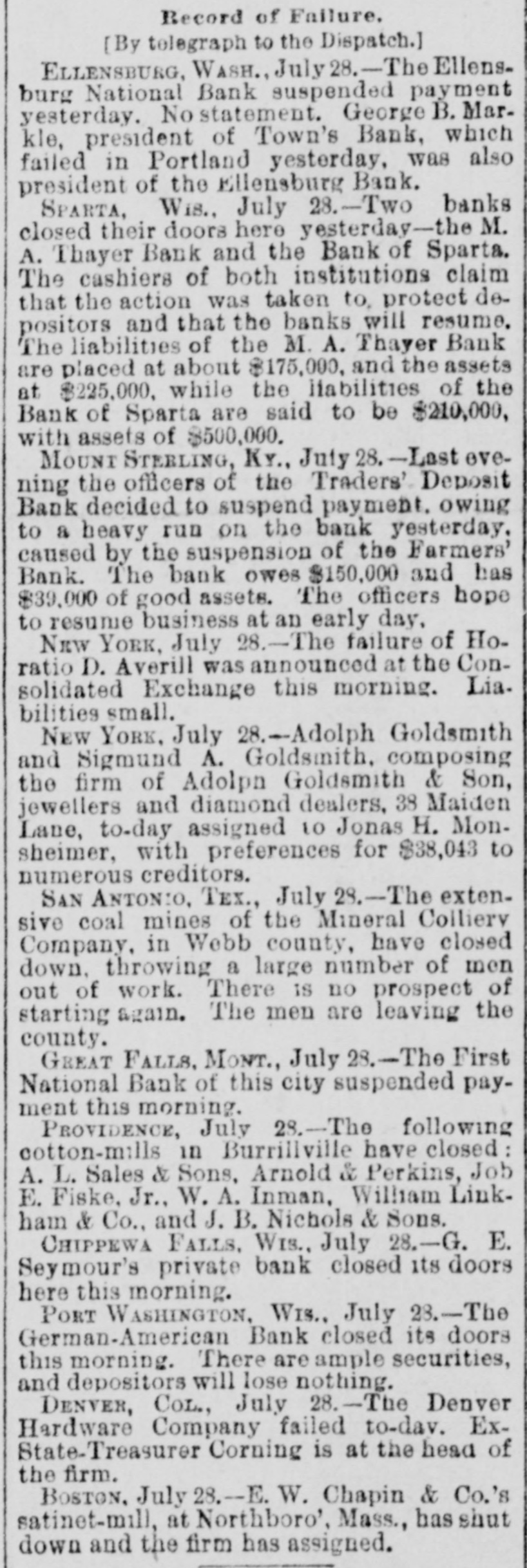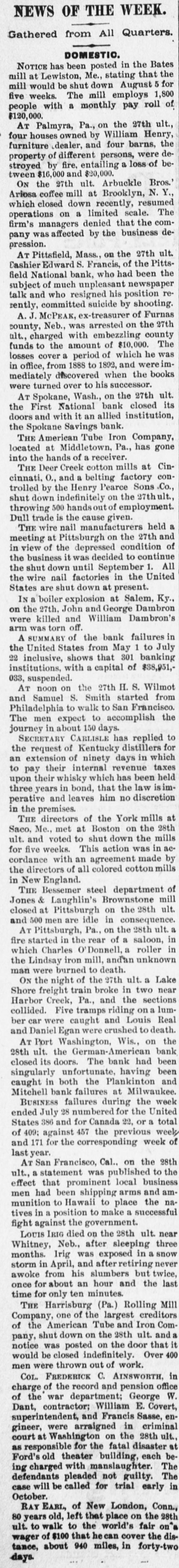 NEWS OF THE WEEK. Gathered from All Quarters. DOMESTIC. NOTICE has been posted in the Bates mill at Lewiston, Me., stating that the mill would be shut down August 5 for five weeks. The mill employs 1,800 people with a monthly pay roll of $120,000. AT Palmyra, Pa., on the 27th ult., four houses owned by William Henry, furniture dealer, and four barns, the property of different persons, were destroyed by fire, entailing a loss of between $16,000 and $20,000. ON the 27th ult. Arbuckle Bros.' Ariosa coffee mill at Brooklyn, N. Y., which closed down recently, resumed operations on a limited scale. The firm's managers denied that the company was affected by the business depression. AT Pittsfield, Mass., on the 27th ult. Cashier Edward S. Francis, of the Pittsfield National bank, who had been the subject of much unpleasant newspaper talk and who resigned his position rerently, committed suicide by shooting. A. J. McPEAK, ex-treasurer of Furnas county, Neb., was arrested on the 27th ult., charged with embezzling county funds to the amount of $10,000. The losses cover a period of which he was in office, from 1888 to 1892, and were immediately discovered when the books were turned over to his successor. AT Spokane, Wash., on the 27th ult. the First National bank closed its doors and with it an allied institution, the Spokane Savings bank. THE American Tube Iron Company, located at Middletown, Pa., has gone into the hands of a receiver. THE Deer Creek cotton mills at Cincinnati, O., and a belting factory controlled by the Henry Pearce Sons .Co., shut down indefinitely on the 27thult., 009 throwing Dull trade is the cause given. THE wire nail manufacturers held a meeting at Pittsburgh on the 27th and in view of the depressed condition of the business it was decided to continue the shut down until September 1. All the wire nail factories in the United States are shut down at present. IN a boiler explosion at Salem, Ky., on the 27th. John and George Dambron were killed and William Dambron's "No torn SEM ULIB up failures rueq the JO V the United States from May 1 to July 22 inclusive, shows that 301 banking institutions, with a capital of $88,951,033, suspended. AT noon on the 27th H. S. Wilmot and Samuel S. Smith started from Philadelphia to walk to San Francisco. The men expect to accomplish the journey in about 150 days. SECRETARY CARLISLE has replied the request of Kentucky distillers for an extension of ninety days in which to pay their internal revenue taxes upon their whisky which has been three years in bond, that the law perative and leaves him no discretion in the premises. THE directors of the York mills Saco. Me., met at Boston on the ult. and voted to shut down the for five weeks. This action was in cordance with an agreement made the directors of all colored cottonmills in New England. THE Bessemer steel department of Jones & Laughlin's Brownstone closed at Pittsburgh on the 28th and 500 men are idle in consequence. AT Pittsburgh, Pa., on the 28th ult. fire started in the rear of a saloon, which Charles O' Donnell, a roller the Lindsay iron mill, andan unknown man were burned to death. ON the night of the 27th ult. a Lake Shore freight train broke in two Harbor Creek, Pa., and the sections collided. Five tramps riding on a lumber car were caught and Louis and Daniel Egan were crushed to death. AT Port Washington, Wis., on 28th ult. the German-American bank closed its doors. The bank had singularly unfortunate, having been caught in both the Plankinton Mitchell bank failures at Milwaukee BUSINESS failures during the week ended July 28 numbered for the United States 386 and for Canada 22, or a of 409: against 457 the previous and 171 for the corresponding week last year. AT San Francisco, Cal.. on the ult., a statement was published to effect that prominent local business men had been shipping arms and munition to Hawaii to place the tives in a position to make a successful fight against the government. LOUIS IRIG died on the 28th ult. Whitney, Neb., after sleeping three B up pesodxe SEM 1 months storm in April, and after retiring awoke from his slumbers but twice once for about an hour and the time for only ten minutes. THE Harrisburg (Pa.) Rolling Company, one of the largest creditors of the American Tube and Iron pany, shut down on the 28th ult. and notice was posted on the door that would be closed indefinitely. Over men were thrown out of work. CoL. FREDERICK C. AINSWORTH,
