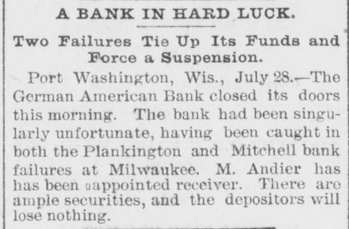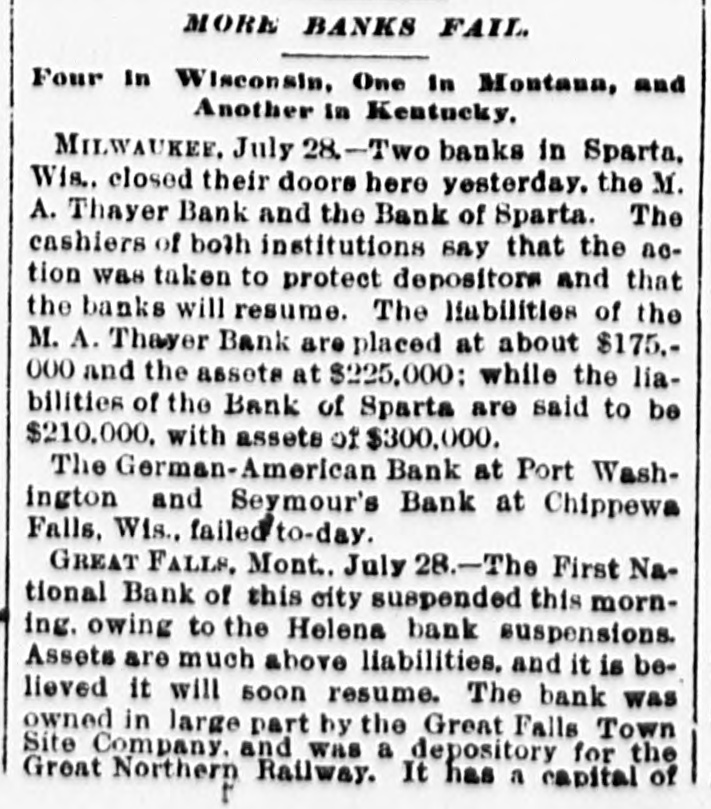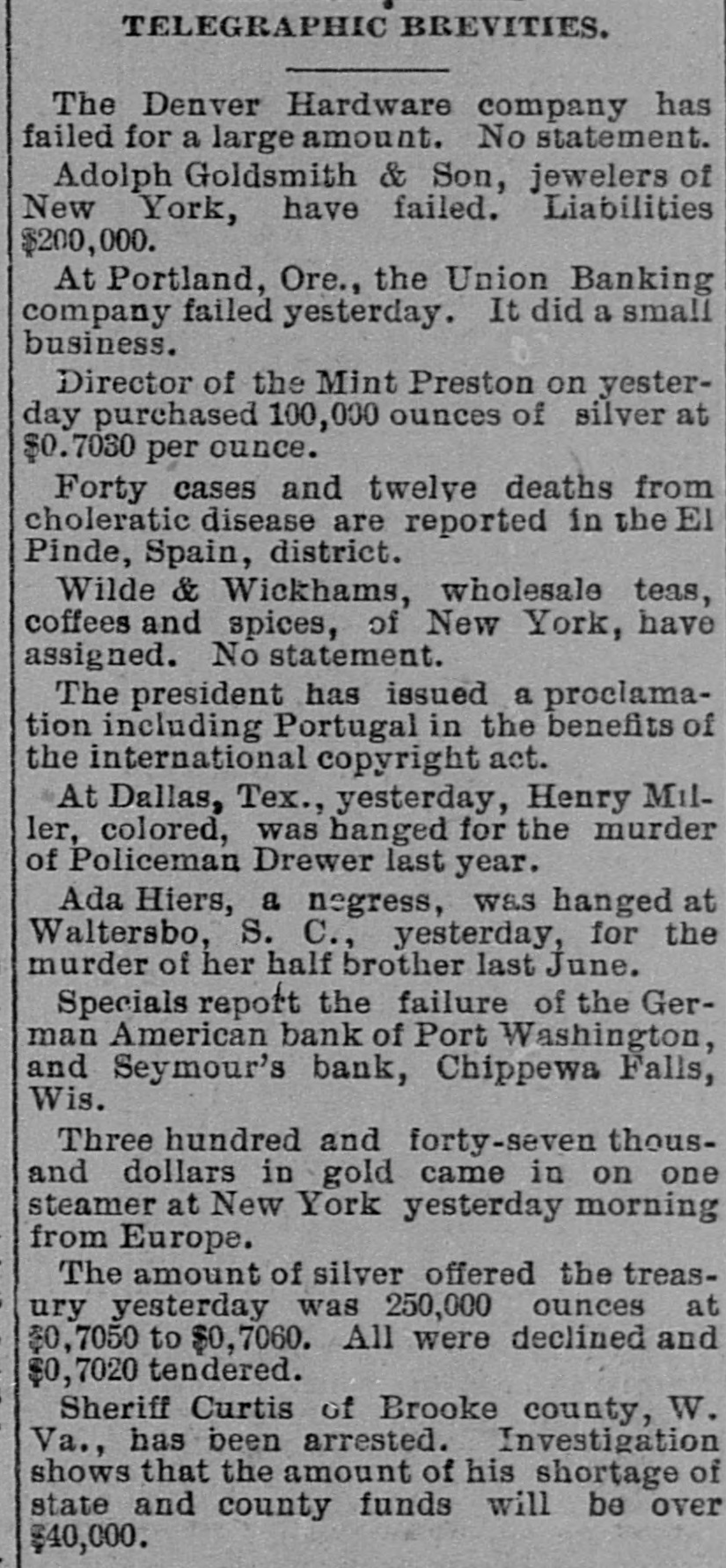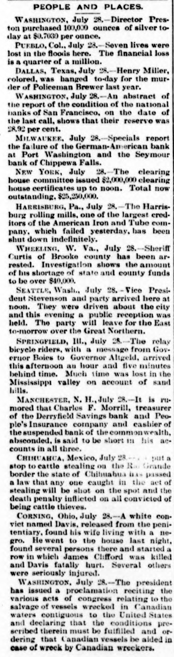 NEWS OF THE WEEK. Gathered from All Quarters. DOMESTIC. NOTICE has been posted in the Bates mill at Lewiston, Me., stating that the mill would be shut down August 5 for five weeks. The mill employs 1,800 people with a monthly pay roll of $120,000. AT Palmyra, Pa., on the 27th ult., four houses owned by William Henry, furniture dealer, and four barns, the property of different persons, were destroyed by fire, entailing a loss of between $16,000 and $20,000. ON the 27th ult. Arbuckle Bros.' Ariosa coffee mill at Brooklyn, N. Y., which closed down recently, resumed operations on a limited scale. The firm's managers denied that the company was affected by the business depression. AT Pittsfield, Mass., on the 27th ult. Cashier Edward S. Francis, of the Pittsfield National bank, who had been the subject of much unpleasant newspaper talk and who resigned his position rerently, committed suicide by shooting. A. J. McPEAK, ex-treasurer of Furnas county, Neb., was arrested on the 27th ult., charged with embezzling county funds to the amount of $10,000. The losses cover a period of which he was in office, from 1888 to 1892, and were immediately discovered when the books were turned over to his successor. AT Spokane, Wash., on the 27th ult. the First National bank closed its doors and with it an allied institution, the Spokane Savings bank. THE American Tube Iron Company, located at Middletown, Pa., has gone into the hands of a receiver. THE Deer Creek cotton mills at Cincinnati, O., and a belting factory controlled by the Henry Pearce Sons .Co., shut down indefinitely on the 27thult., 009 throwing Dull trade is the cause given. THE wire nail manufacturers held a meeting at Pittsburgh on the 27th and in view of the depressed condition of the business it was decided to continue the shut down until September 1. All the wire nail factories in the United States are shut down at present. IN a boiler explosion at Salem, Ky., on the 27th. John and George Dambron were killed and William Dambron's "No torn SEM ULIB up failures rueq the JO V the United States from May 1 to July 22 inclusive, shows that 301 banking institutions, with a capital of $88,951,033, suspended. AT noon on the 27th H. S. Wilmot and Samuel S. Smith started from Philadelphia to walk to San Francisco. The men expect to accomplish the journey in about 150 days. SECRETARY CARLISLE has replied the request of Kentucky distillers for an extension of ninety days in which to pay their internal revenue taxes upon their whisky which has been three years in bond, that the law perative and leaves him no discretion in the premises. THE directors of the York mills Saco. Me., met at Boston on the ult. and voted to shut down the for five weeks. This action was in cordance with an agreement made the directors of all colored cottonmills in New England. THE Bessemer steel department of Jones & Laughlin's Brownstone closed at Pittsburgh on the 28th and 500 men are idle in consequence. AT Pittsburgh, Pa., on the 28th ult. fire started in the rear of a saloon, which Charles O' Donnell, a roller the Lindsay iron mill, andan unknown man were burned to death. ON the night of the 27th ult. a Lake Shore freight train broke in two Harbor Creek, Pa., and the sections collided. Five tramps riding on a lumber car were caught and Louis and Daniel Egan were crushed to death. AT Port Washington, Wis., on 28th ult. the German-American bank closed its doors. The bank had singularly unfortunate, having been caught in both the Plankinton Mitchell bank failures at Milwaukee BUSINESS failures during the week ended July 28 numbered for the United States 386 and for Canada 22, or a of 409: against 457 the previous and 171 for the corresponding week last year. AT San Francisco, Cal.. on the ult., a statement was published to effect that prominent local business men had been shipping arms and munition to Hawaii to place the tives in a position to make a successful fight against the government. LOUIS IRIG died on the 28th ult. Whitney, Neb., after sleeping three B up pesodxe SEM 1 months storm in April, and after retiring awoke from his slumbers but twice once for about an hour and the time for only ten minutes. THE Harrisburg (Pa.) Rolling Company, one of the largest creditors of the American Tube and Iron pany, shut down on the 28th ult. and notice was posted on the door that would be closed indefinitely. Over men were thrown out of work. CoL. FREDERICK C. AINSWORTH,