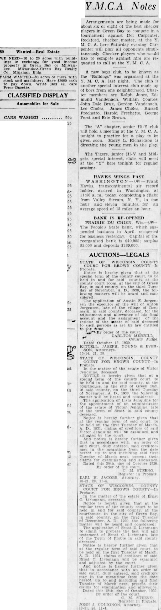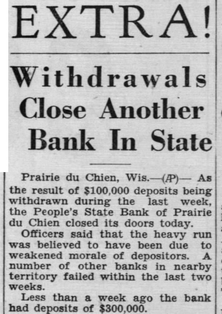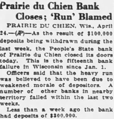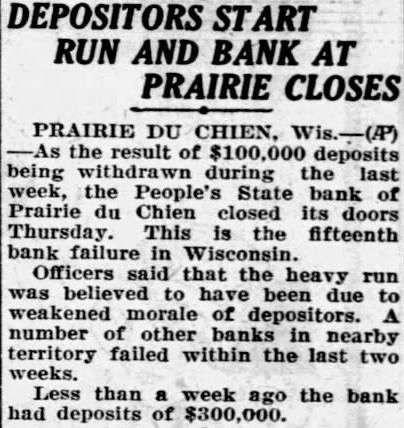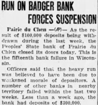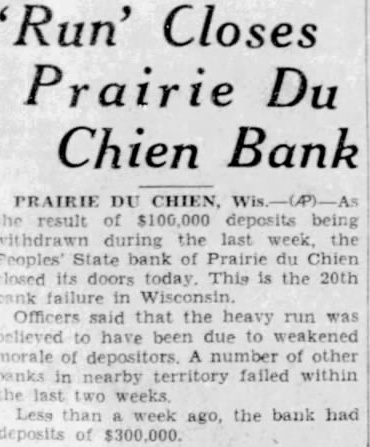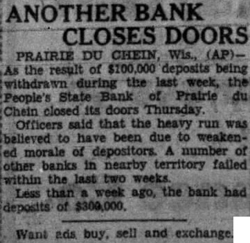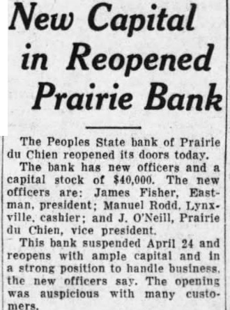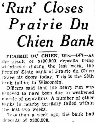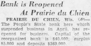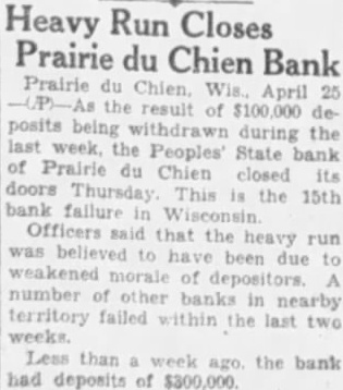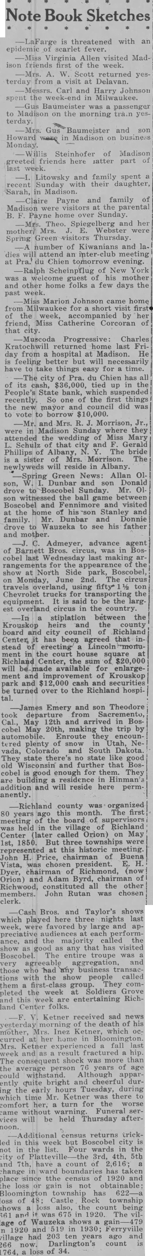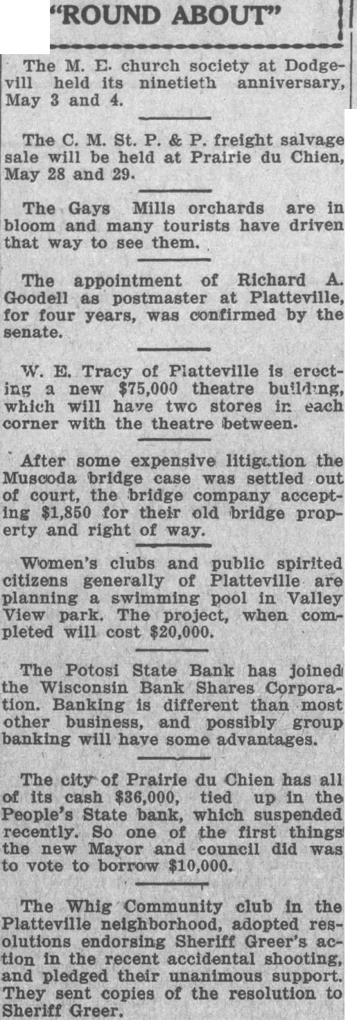 Mary Alice Becker, 4, daughter of an A&P manager at Center, fell from a second story window but landed on a ledge where she hung until rescued. Wilbur Richards, Dodgeville farmer, has SOW that gave birth to a freak pig. The offspring consisted of two complete pigs joined together at the right shoulders. The animal lived but a few minutes. Robt. 12, son of Mr. and Mrs. Ed. Zickerman, Dodgeville farmers, was kicked in the face and mutilated by a horse, Tuesday. The boy was found lying in the field and taken to a hospital. He will recover but his face will be scarred for life. McKinley Bros,, mining at Dodgeville, have a new shaft into a 20-inch sheet of solid jack. The mine is full of water unless and pumps are kept working constantly. Mrs. Trankle, residing with Mr. and Mrs. John Miller of near Livingston, was 93 years of age Tuesday. Relatives and friends-gathered at the house and made the occasion a gala affair. 162 head of prime Guernsey cattle were disposed of at the Vernon county uGernsey sale, Wednesday. F. O. Lowe of Petersburg, was the heaviest buyer, taking 41 head with a top of $145. The sale total came to $13,270, with an average of $81.90. Harry Bovay, the promoter who secured the franchise for the Pra. du Chien to Marquette bridge, announced Saturday that, the million dollar bond issue had been signed. Bovay says construction will start this summer and that the project will be rushed to completion. Sheriff Hinkins of Darlington, out riding Sunday night, collided with a car driven by one Louis Anderson. Anderson was arrested and placed in jail on charge of driving while intoxicated. During his first night in jail the man slashed a wrist and almost bled to death. Several thousand trout were cared for in a pond by Montfort sportsmen until they. attained size of four to six inches. The fish were then let loose in a stream known as Sevenfoot branch, near the village. The Montfort club has plan of establishing a pond on Blue river, near the Forman-Zoha farm. The death of Veteran Geo. Hodge at the age of 90, left Pra. du Chien with but one surviving veteran of the Civil war. He is Comrade C. A. Huard. Mr. Hodge was member of a New York regiment. Following the war he came west to reside in Grant county. In recent years he made his home with an adopted daughter, Mrs. Roy Koecke, of Pra. du Chien. "Taps" sounded for Comrade Hodge Sunday a week ago. Nat Cerutti, Dodgeville monument dealer, worked hard day and night to get his jobs completed by Memorial day. Upon arising one "morning last week he took a huge yawn and his jaws locked with his mouth open so that he could neither talk or swallow. physician administered an anesthetic and under the influence of the drug the jaws relaxed and Nat awoke as well as usual. As there is no classification for the nature of this disease it may be called "Monument man's jaw."
