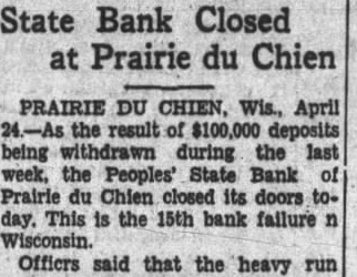 May 23rd was the 52nd anniversary of the Mineral Point tornado. Jacob Miller of Boscobel died recently. He was a Civil war veteran. Robert Zickerman, 12 year old lad of Livingston, was kicked in the head by a horse. He was found lying in the field. Several stitches were required to close the cuts. The city of Pra. had du Chien had $36,000 on deposit in the Peoples State bank when it suspended. The city had to negotiate a loan of $16,000 to carry on operations. Prof. Kexel who has been teaching in the Cuba City Schools for four years has been engaged as principal of the Ridgeway School. Riley Livingston, present principal, continues his studies at the university. Mrs. Anna Bridges died Wednesday after a long illness at the home of Mrs. Llu Bridges. Funeral services were held at the Concklin Funeral Home at one o'clock Friday. Interment was made at Mineral Point.Platteville News. The Mike Grea store and dance hall and the Korth garage at Hillpoint were destroyed by fire Thursday night. The Loganville fire laddies helped to combat the blaze and two of them, Wm. Voss and Paul Roewer, received burns. The loss was $10,000.