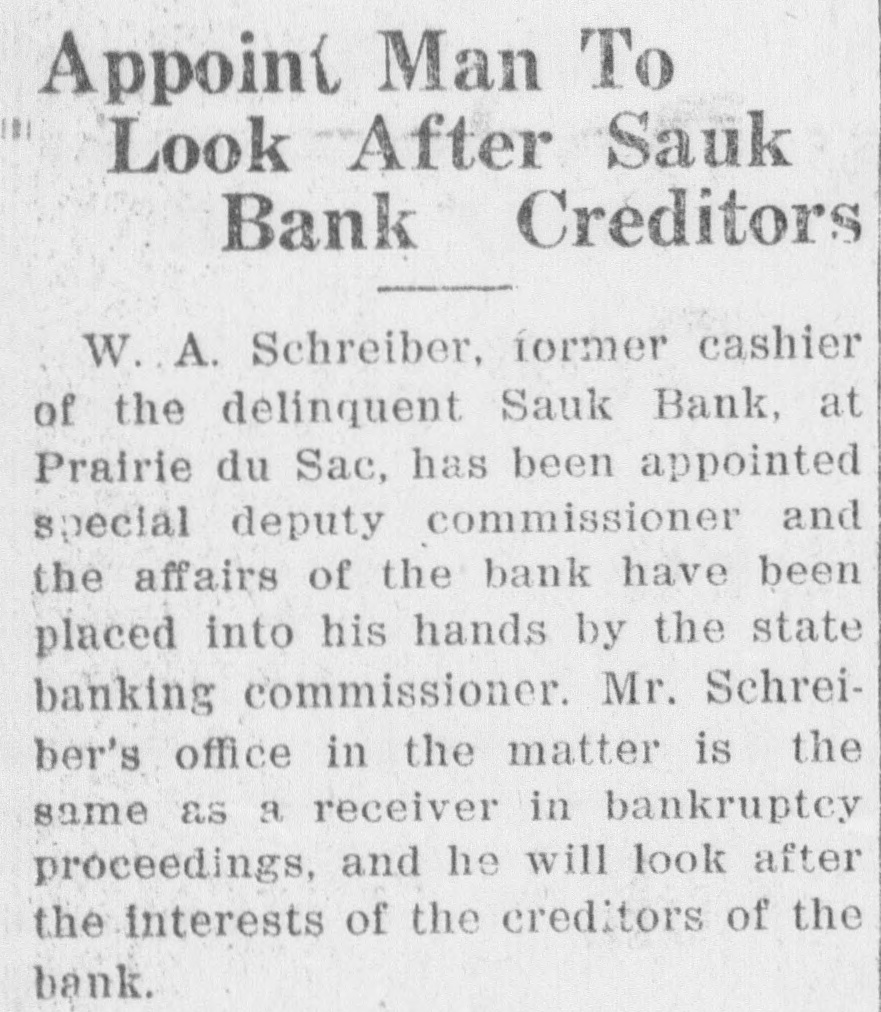 Appoint Man To Look After Sauk Bank Creditors W. A. Schreiber, íormer cashier of the delinquent Sauk Bank, at Prairie du Sac, has been appointed special deputy commissioner and the affairs of the bank have been placed into his hands by the state banking commissioner. Mr. Schreiber's office in the matter is the same as a receiver in bankruptcy proceedings, and he will look after the interests of the creditors of the bank.