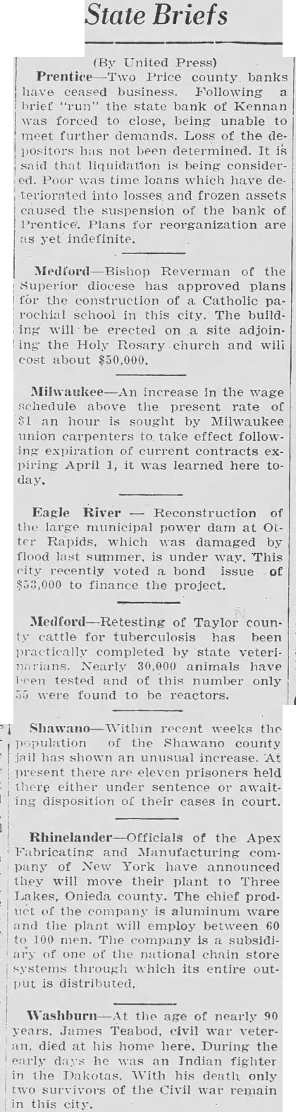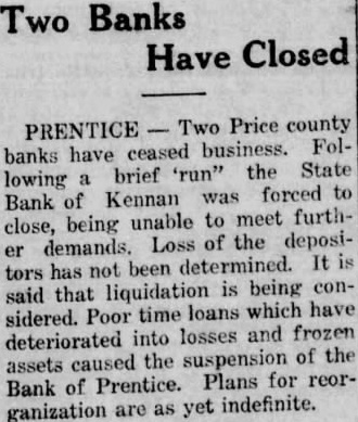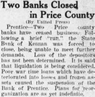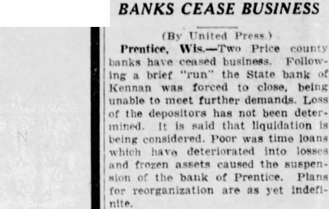 (By United Press) Prentice Price county banks censed Following brief "run" the state bank of Kennan was forced to close, being unable to meet further demands. Loss of the dehas not been It is said that liquidation is being considered. Poor was time loans which have deteriorated into losses and frozen assets caused the of the bank of Prentice. Plans for reorganization are as yet indefinite