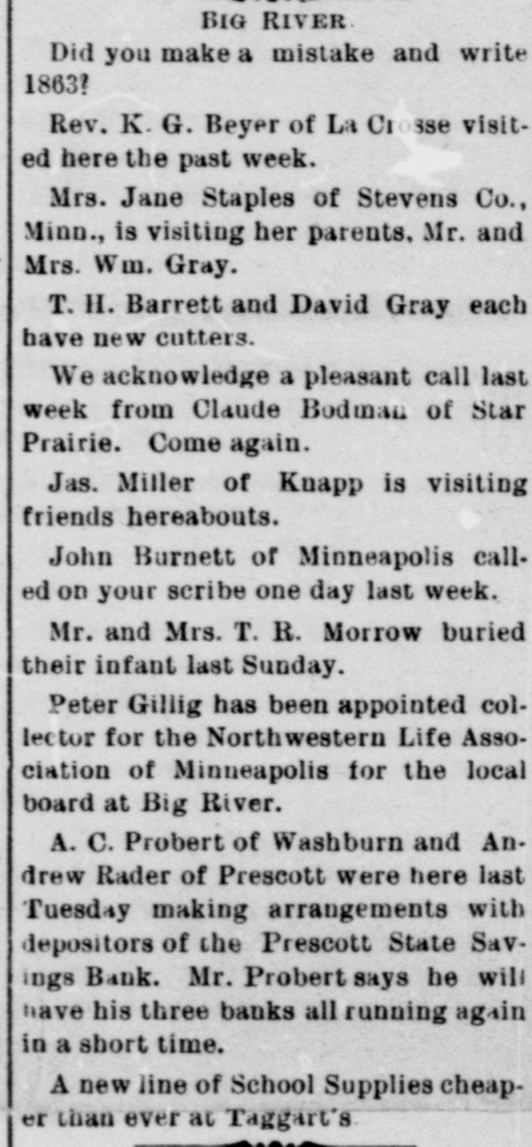 BIG RIVER. Did you make a mistake and write 1863? Rev. K. G. Beyer of La Crosse visited here the past week. Mrs. Jane Staples of Stevens Co., Minn., is visiting her parents, Mr. and Mrs. Wm. Gray. T. H. Barrett and David Gray each have new cutters. We acknowledge a pleasant call last week from Claude Bodman of Star Prairie. Come again. Jas. Miller of Knapp is visiting friends hereabouts. John Burnett of Minneapolis called on your scribe one day last week. Mr. and Mrs. T. R. Morrow buried their infant last Sunday. Peter Gillig has been appointed collector for the Northwestern Life Association of Minneapolis for the local board at Big River. A. C. Probert of Washburn and Andrew Rader of Prescott were here last Tuesday making arrangements with depositors of the Prescott State Savings Bank. Mr. Probert says be will have his three banks all running again in a short time. A new line of School Supplies cheaper than ever at Taggart's