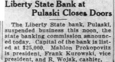 Liberty State Bank at Pulaski Closes Doors The Liberty State bank, Pulaski, this noon, the state banking today. Capital of the bank is ed at $25,000. Prokopovitz president, Frank Kurowski. vice president, and R. Wojak, cashier.