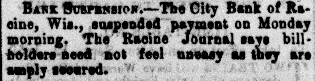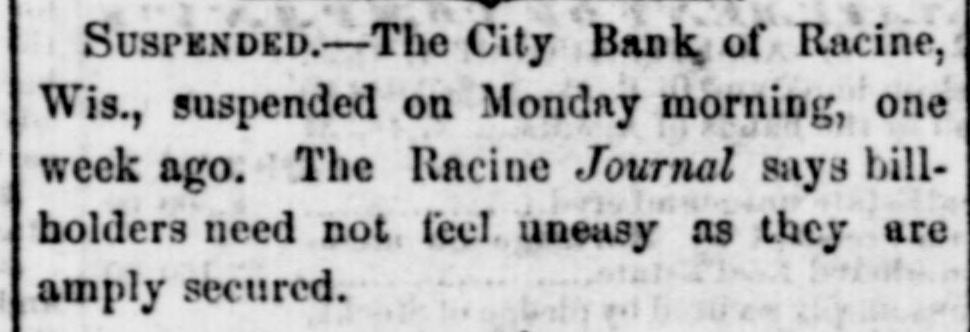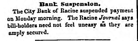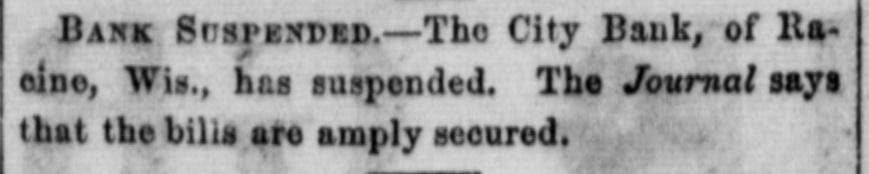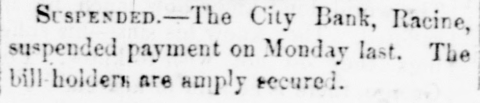 Bank Suspension. The City Bank of Racine suspended payment on Monday morning. The Racine Journal says bill-holders need not feel uneasy as they are amply secured.