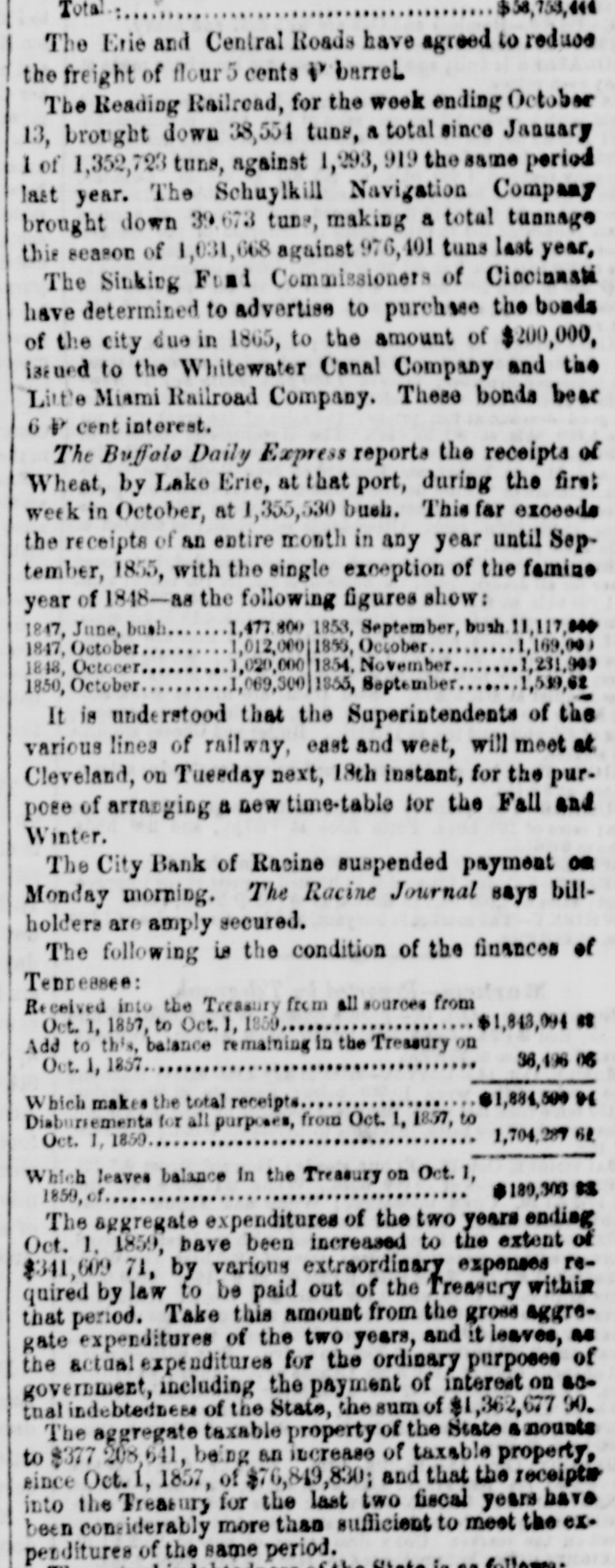 Total The Erie and Central Roads have agreed to reduce the freight of flour 5 cents P barrel The Reading Railroad, for the week ending October 13, brought down 38,554 tuns, a total since January 1 of 1,352,723 tuns, against 1,293, 919 the same period last year. The Schuylkill Navigation Company brought down 39.673 tune, making & total tunnage this season of 1,031,668 against 976,401 tuns last year, The Sinking Fond Commissioners of Ciocinnati have determined to advertise to purchase the bonds of the city due in 1865, to the amount of $200,000, issued to the Whitewater Canal Company and the Little Miami Railroad Company. These bonds bear 6 P cent interest. The Buffalo Daily Express reports the receipts of Wheat, by Lake Erie, at that port, during the first week in October, at 1,355,530 bush. This far exceeds the receipts of an entire month in any year until September, 1855, with the single exception of the famine year of 1848-as the following figures show: 1,477.800 1853, September, bush 11,117,000 1847, June, bush 1,169,000 1,012,000 1853, October 1847, October 1854, November 1,231,900 1,020,000 1848, Octocer 1,539,62 1,069,500 1855, September 1850, October It is understood that the Superintendents of the various lines of railway, east and west, will meet at Cleveland, on Tuesday next, 18th instant, for the purpose of arranging a new time-table for the Fall and Winter. The City Bank of Racine suspended payment OR Monday morning. The Racine Journal says billholders are amply secured. The following is the condition of the finances of Tennessee: Received into the Treasury from all sources from $1,843,094 # Oct. 1, 1857, to Oct. 1, 1859 Add to this, balance remaining in the Treasury on 36,496 06 Oct. 1, 1857 $1,884,500 H Which makes the total receipts Disbursements for all purposes, from Oct. 1, 1857, to 1,704,287 62 Oct. 1, 1859 Which leaves balance in the Treasury on Oct. 1, $180,303 $3 1859, of The aggregate expenditures of the two years ending Oct. 1, 1859, have been increased to the extent of $341,609 71, by various extraordinary expenses required by law to be paid out of the Treasury within that period. Take this amount from the gross aggregate expenditures of the two years, and it leaves, as the actual expenditures for the ordinary purposes of government, including the payment of interest on actual indebtedness of the State, the sum of $1,362,677 90. The aggregate taxable property of the State a mounts to $377 208,641, being an increase of taxable property, since Oct. 1, 1857, of $76,849,830; and that the receipts into the Treasury for the last two fiscal years have been considerably more than sufficient to meet the expenditures of the same period. fike State la en follows: