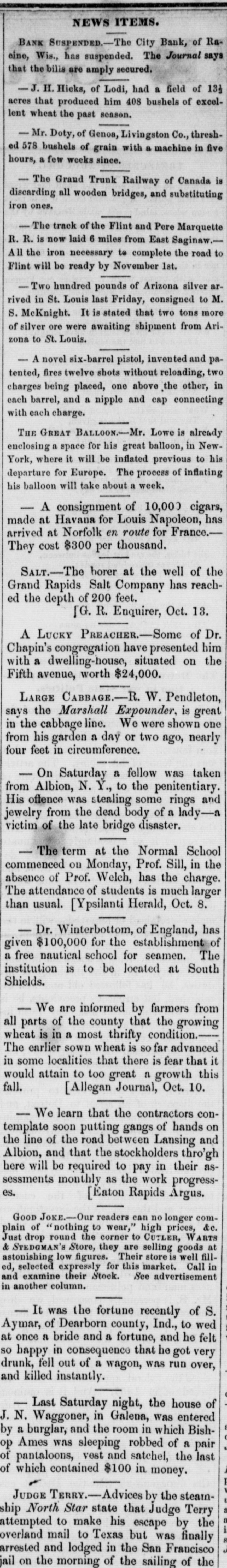 NEWS ITEMS. BANK SUSPENDED.-The City Bank, of Raeine, Wis., has suspended. The Journal says that the bills are amply secured. J. H. Hicks, of Lodi, had a field of 13} acres that produced him 408 bushels of excellent wheat the past season. - Mr. Doty, of Genoa, Livingston Co., threshed 578 bushels of grain with a machine in five hours, a few weeks since. - The Grand Trunk Railway of Canada is discarding all wooden bridges, and substituting iron ones. - The track of the Flint and Pere Marquette R. R. is now laid 6 miles from East Saginaw.All the iron necessary to complete the road to Flint will be ready by November 1st. - Two hundred pounds of Arizona silver arrived in St. Louis last Friday, consigned to M. S. McKnight. It is stated that two tons more of silver ore were awaiting shipment from Arizona to St. Louis. - A novel six-barrel pistol, invented and patented, fires twelve shots without reloading, two charges being placed, one above [the other, in each barrel, and a nipple and cap connecting with each charge. THE GREAT BALLOON.-Mr. Lowe is already enclosing a space for his great balloon, in NewYork, where it will be inflated previous to his departure for Europe. The process of inflating his balloon will take about a week. - A consignment of 10,000 cigars, made at Havana for Louis Napoleon, has arrived at Norfolk en route for France.— They cost $300 per thousand. SALT.-The borer at the well of the Grand Rapids Salt Company has reached the depth of 200 feet. [G. R. Enquirer, Oct. 13. A LUCKY PREACHER.Some of Dr. Chapin's congregation have presented him with a dwelling-house, situated on the Fifth avenue, worth $24,000. LARGE CABBAGE.-R. W. Pendleton, says the Marshall Expounder, is great in the cabbage line. We were shown one from his garden a day or two ago, nearly four feet in circumference. - On Saturday a fellow was taken from Albion, N. Y., to the penitentiary. His offence was stealing some rings and jewelry from the dead body of a lady-a victim of the late bridge disaster. - The term at the Normal School commenced on Monday, Prof. Sill, in the absence of Prof. Welch, has the charge. The attendance of students is much larger than usual. [Ypsilanti Herald, Oct. 8. - Dr. Winterbottom, of England, has given $100,000 for the establishment of a free nautical school for seamen. The institution is to be located at South Shields. - We are informed by farmers from all parts of the county that the growing wheat is in a most thrifty condition.— The earlier sown wheat is SO far advanced in some localities that there is fear that it would attain to too great a growth this fall. [Allegan Journal, Oct. 10. - We learn that the contractors contemplate soon putting gangs of hands on the line of the road between Lansing and Albion, and that the stockholders thro'gh here will be required to pay in their assessments monthly as the work progresses. [Eaton Rapids Argus. GOOD JOKE.-Our readers can no longer complain of "nothing to wear," high prices, &c. Just drop round the corner to CUTLER, ARTS & STEDGMAN'S Store, they are selling goods at astonishing low figures. Their store is well filled, selected expressly for this market. Call in and examine their Stock. See advertisement in another column. - It was the fortune recently of S. Aymar, of Dearborn county, Ind., to wed at once a bride and a fortune, and he felt so happy in consequence that he got very drunk, fell out of a wagon, was run over, and killed instantly. - Last Saturday night, the house of N. Waggoner, in Galena, was entered by a burglar, and the room in which BishAmes was sleeping robbed of a pair of pantaloons, vest and satchel, the last of which contained $100 in money. JUDGE TERRY.-Advices by the steamship North Star state that Judge Terry attempted to make his escape by the overland mail to Texas but was finally arrested and lodged in the San Francisco
