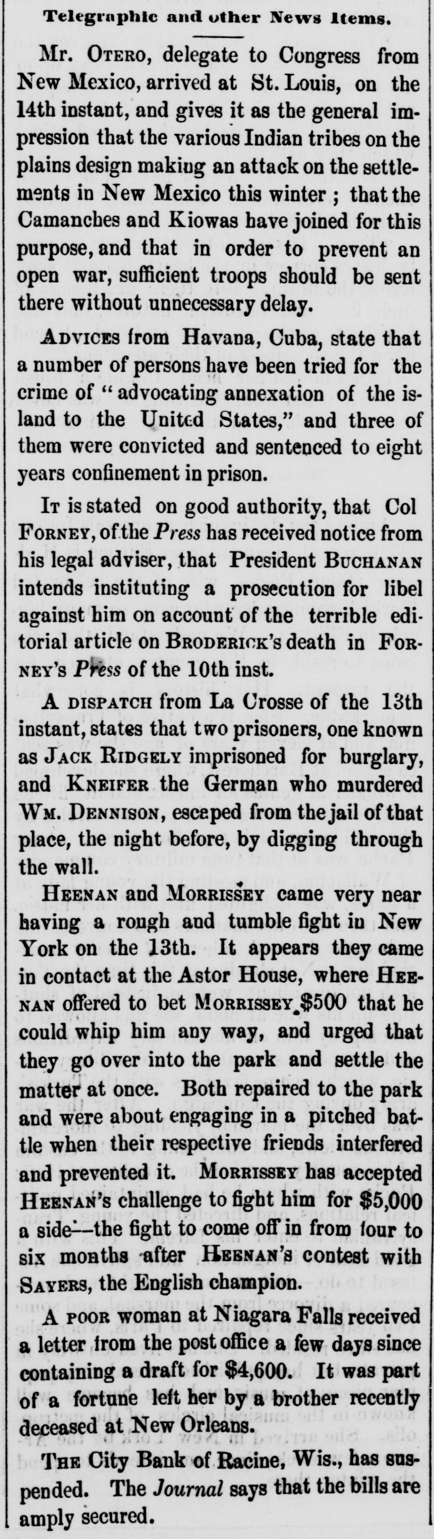 Telegraphic and other News Items. Mr. OTERO, delegate to Congress from New Mexico, arrived at St. Louis, on the 14th instant, and gives it as the general impression that the various Indian tribes on the plains design making an attack on the settlements in New Mexico this winter ; that the Camanches and Kiowas have joined for this purpose, and that in order to prevent an open war, sufficient troops should be sent there without unnecessary delay. ADVICES from Havana, Cuba, state that a number of persons have been tried for the crime of advocating annexation of the island to the United States," and three of them were convicted and sentenced to eight years confinement in prison. IT is stated on good authority, that Col FORNEY, of the Press has received notice from his legal adviser, that President BUCHANAN intends instituting a prosecution for libel against him on account of the terrible editorial article on BRODERICK'S death in FORNEY'S Press of the 10th inst. A DISPATCH from La Crosse of the 13th instant, states that two prisoners, one known as JACK RIDGELY imprisoned for burglary, and KNEIFER the German who murdered WM. DENNISON, escaped from the jail of that place, the night before, by digging through the wall. HEENAN and MORRISSEY came very near having a rough and tumble fight in New York on the 13th. It appears they came in contact at the Astor House, where HEENAN offered to bet MORRISSEY $500 that he could whip him any way, and urged that they go over into the park and settle the matter at once. Both repaired to the park and were about engaging in a pitched battle when their respective friends interfered and prevented it. MORRISSEY has accepted HEENAN'S challenge to fight him for $5,000 a side-the fight to come off in from four to six months after HEENAN'S contest with SAYERS, the English champion. A POOR woman at Niagara Falls received a letter from the post office a few days since containing a draft for $4,600. It was part of a fortune left her by a brother recently deceased at New Orleans. THE City Bank of Racine, Wis., has suspended. The Journal says that the bills are amply secured.