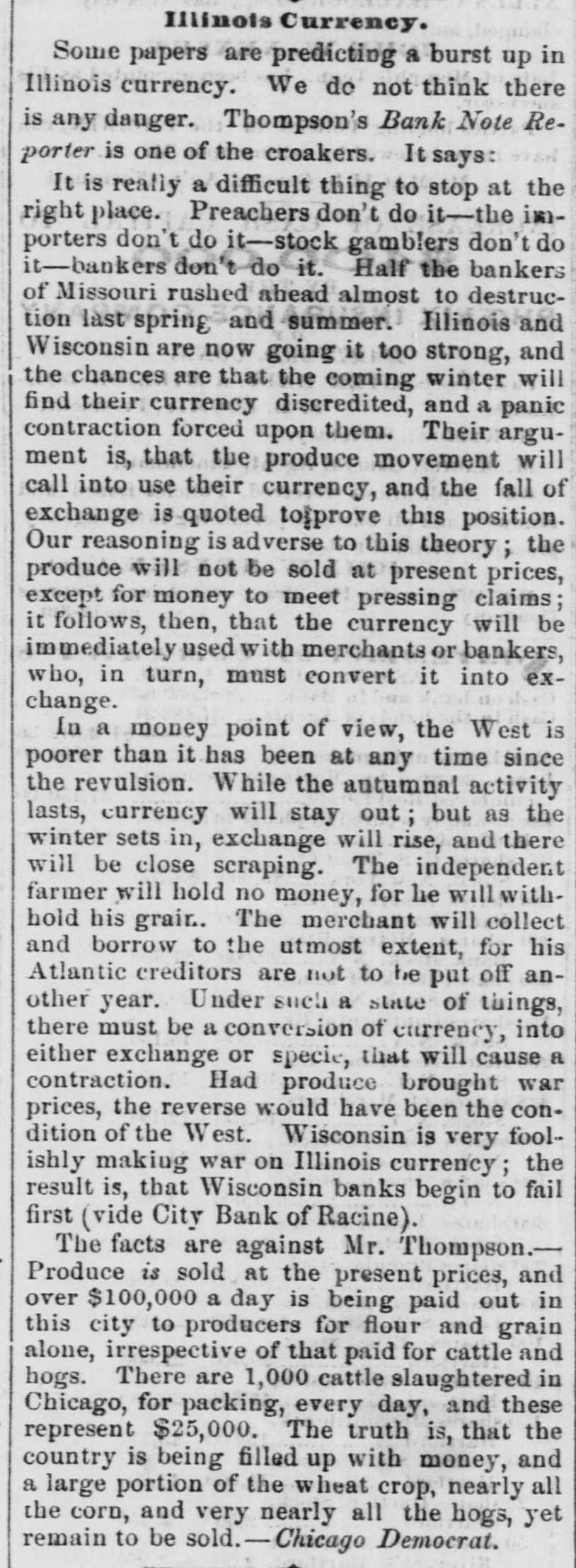 Illinois Currency. Some papers are predicting a burst up in Illinois currency. We do not think there is any danger. Thompson's Bank Note Reporter is one of the croakers. It says: It is really a difficult thing to stop at the right place. Preachers don't do it-the importers don't do it-stock gamblers don't do it-bankers don't do it. Half the bankers of Missouri rushed ahead almost to destruction last spring and summer. Illinois and Wisconsin are now going it too strong, and the chances are that the coming winter will find their currency discredited, and a panic contraction forced upon them. Their argument is, that the produce movement will call into use their currency, and the fall of exchange is quoted toiprove this position. Our reasoning is adverse to this theory; the produce will not be sold at present prices, except for money to meet pressing claims; it follows, then, that the currency will be immediately used with merchants or bankers, who, in turn, must convert it into exchange. In a money point of view, the West is poorer than it has been at any time since the revulsion. While the autumnal activity lasts, currency will stay out; but as the winter sets in, exchange will rise, and there will be close scraping. The independent farmer will hold no money, for he will withhold his grain. The merchant will collect and borrow to the utmost extent, for his Atlantic creditors are not to be put off another year. Under such a state of things, there must be a conversion of currency, into either exchange or specie, that will cause a contraction. Had produce brought war prices, the reverse would have been the condition of the West. Wisconsin is very foolishly making war on Illinois currency; the result is, that Wisconsin banks begin to fail first (vide City Bank of Racine). The facts are against Mr. Thompson.Produce is sold at the present prices, and over $100,000 a day is being paid out in this city to producers for flour and grain alone, irrespective of that paid for cattle and hogs. There are 1,000 cattle slaughtered in Chicago, for packing, every day, and these represent $25,000. The truth is, that the country is being filled up with money, and a large portion of the wheat crop, nearly all the corn, and very nearly all the hogs, yet remain to be sold.-Chicago Democrat.