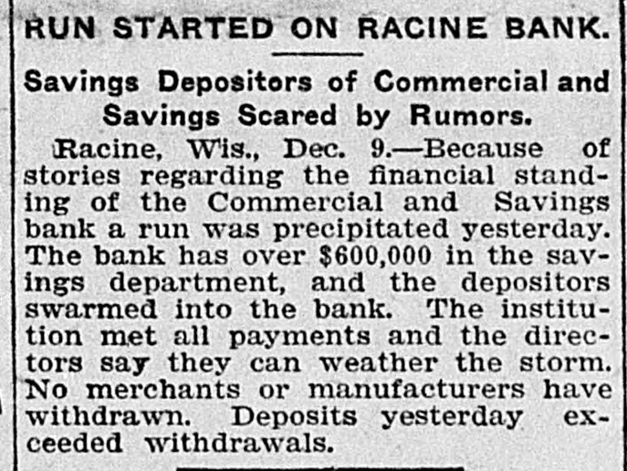 RUN STARTED ON RACINE BANK. Savings Depositors of Commercial and Savings Scared by Rumors. Racine, Wis., Dec. 9.-Because of stories regarding the financial standing of the Commercial and Savings bank a run was precipitated yesterday. The bank has over $600,000 in the savings department, and the depositors swarmed into the bank. The institution met all payments and the directors say they can weather the storm. No merchants or manufacturers have withdrawn. Deposits yesterday exceeded withdrawals.