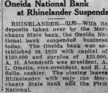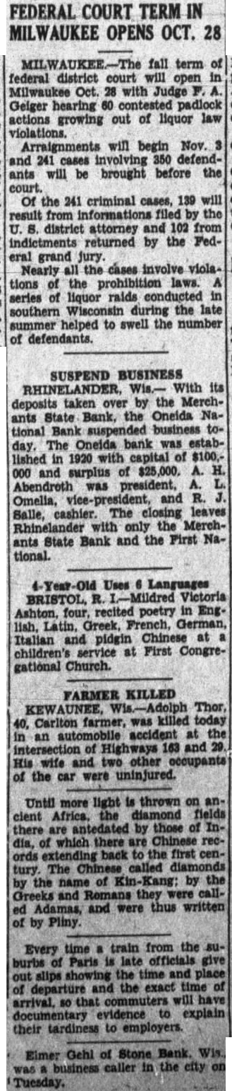 FEDERAL COURT TERM OPENS OCT. 28 fall term federal district court will open Milwaukee Oct. with Judge Geiger hearing padlock actions growing out of liquor law violations. Arraignments will begin Nov. and 241 involving defendants will be brought before the court. Of the 241 criminal will result from informations filed by the district attorney and 102 from indictments returned by the Fedgrand jury. Nearly cases involve violations the prohibition laws. series liquor raids southern Wisconsin during the late summer helped to swell the number defendants. SUSPEND BUSINESS its taken over the Merchdeposits ants State Bank, the Oneida National The Oneida bank was established in 1920 capital $100,000 and surplus of Abendroth president, Omelia, and Salle, cashier. The closing leaves Rhinelander with only the Merchand the First Naants State Bank tional. Uses Languages Victoria recited poetry EngLatin, Greek, French, German, Italian and pidgin Chinese at children's service at First Congregational Church. FARMER KILLED Thor, Carlton killed today farmer, accident the an Highways 163 and His wife and other the were uninjured. Until more light thrown on Africa, diamond fields there antedated by of Inwhich there Chinese recdia, extending back the first The Chinese called tury. the name Greeks and Adamas, were written Pliny. Every time train from the burbs Paris late officials the time and the exact time explain their tardiness to employers. Eimer Gehi of Stone Bank. business in the city Tuesday.