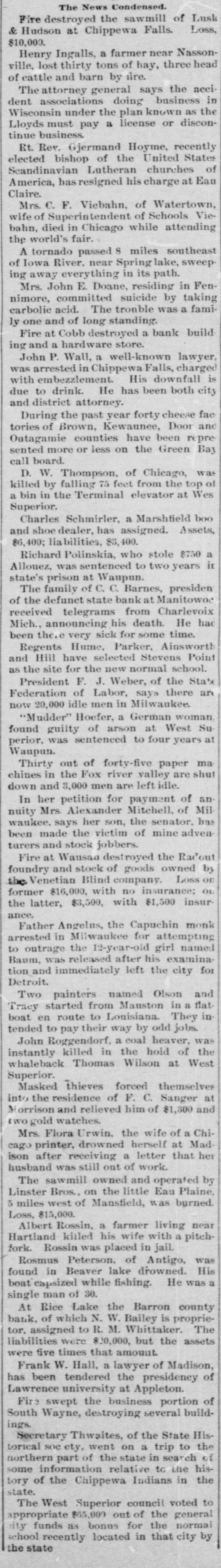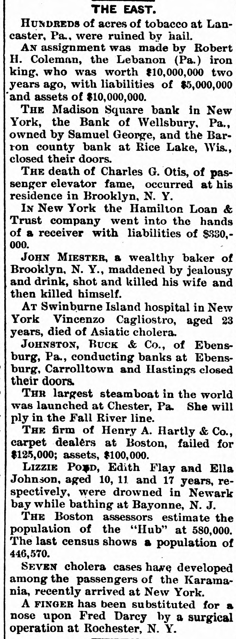 HUNDREDS of acres of tobacco at Lancaster, Pa., were ruined by hail. AN assignment was made by Robert H. Coleman, the Lebanon (Pa.) iron king, who was worth $10,000,000 two years ago, with liabilities of $5,000,000 and assets of $10,000,000. THE Madison Square bank in New York, the Bank of Wellsbury, Pa., owned by Samuel George, and the Barron county bank at Rice Lake, Wis., closed their doors. THE death of Charles G. Otis, of passenger elevator fame, occurred at his residence in Brooklyn, N. Y. IN New York the Hamilton Loan & Trust company went into the hands of a receiver with liabilities of $330,000. JOHN MIESTER, a wealthy baker of Brooklyn, N. Y., maddened by jealousy and drink, shot and killed his wife and then killed himself. AT Swinburne Island hospital in New York Vincenzo Cagliostro, aged 23 years, died of Asiatic cholera. JOHNSTON, BUCK & Co., of Ebensburg, Pa., conducting banks at Ebensburg, Carrolltown and Hastings closed their doors. THR largest steamboat in the world was launched at Chester, Pa. She will ply in the Fall River line. THE firm of Henry A. Hartly & Co., carpet dealers at Boston, failed for $125,000; assets, $100,000. LIZZIE POLD, Edith Flay and Ella Johnson, aged 10, 11 and 17 years, respectively, were drowned in Newark bay while bathing at Bayonne, N. J. THE Boston assessors estimate the population of the "Hub" at 580,000. The last census shows a population of 446,570. SEVEN cholera cases have developed among the passengers of the Karamania, recently arrived at New York. A FINGER has been substituted for a nose upon Fred Darcy by a surgical operation at Rochester, N. Y. WEST AND SOUTH. FIRE destroyed the Port Pitt tanneries and the warehouses of the Consolidated Wire company at Rankin, O., the loss being $125,000. MRS. ELIJAH DALTON, of Borden, Ind., was taken from the home of her husband by white caps and whipped terribly with hickorv switches. AT Mishawaka, Ind., A. D. Baker, owner of the wagon works, failed for $120,000. AT the Chicago stock yards Swift & Co., packers, laid off 500 men and reduced the wages of the remaining employes 10 per cent. FIVE women at Higbee, Mo., horsewhipped James Collins, who insulted one of their number. A BOILER explosion wrecked the Cadwallader flouring mill at Fostoria, o., and G. Davis, secretary of the mill, and F.C. Myers, bookkeeper, were killed. RESIDENTS of Glendive, Mont., gave a coat of tar to a white man and a garment of alabastine to his colored bride and ordered them out of town. THE stables of the driving park at Connersville, Ind., were burned and seven valuable horses were cremated. FLAMES destroyed all but two stores and a few houses at Snow Hill, Md., the loss being $300,000. GREAT destitution and suffering prevailed among the boomers along the Kansas line of the Cherokee strip. FLAMES nearly wiped out the village of Derby, Ind., the loss being over $100,000. A CIGARETTE caused the destruction by fire of much of the business part of Sidell, III. ALMOST the entire business part of Barnard, Mo., was destroyed by fire. JAMES JACOBS' livery stable at Goshen, Ind., was burned and twentyfive horses were cremated. FIRE ruined the business portion of South Wayne, Wis.