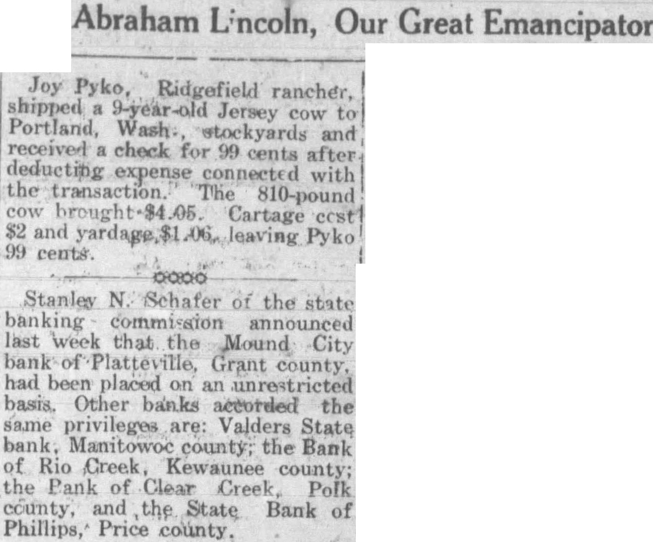 Abraham Lincoln, Our Great Emancipator Joy Pyko, Ridgefield rancher, shipped a 9-year-old Jersey cow to Portland, Wash. stockyards and received a check for 99 cents after deducting expense connected with the transaction. The 810-pound $2 and yardage,$1 leaving Pyko 99 cents. Stanley N. Schafer of the state banking commission announced last week that the Mound City bank of Platteville, Grant county, had been placed on an unrestricted basis. Other banks accorded the same privileges are: Valders State bank, Manitowoc county; the Bank of Rio Creek, Kewaunee county; the Bank of Clear Creek Polk county, and the State Bank of Phillips, Price county.