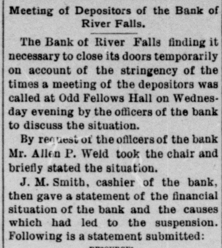 Meeting of Depositors of the Bank of River Falls. The Bank of River Falls finding it necessary to close its doors temporarily on account of the stringency of the times a meeting of the depositors was called at Odd Fellows Hall on Wednesday evening by the officers of the bank to discuss the situation. By request of the officers of the bank Mr. Allen P. Weld took the chair and briefly stated the situation. J. M. Smith, cashier of the bank, then gave a statement of the financial situation of the bank and the causes which had led to the suspension. Following is a statement submitted: