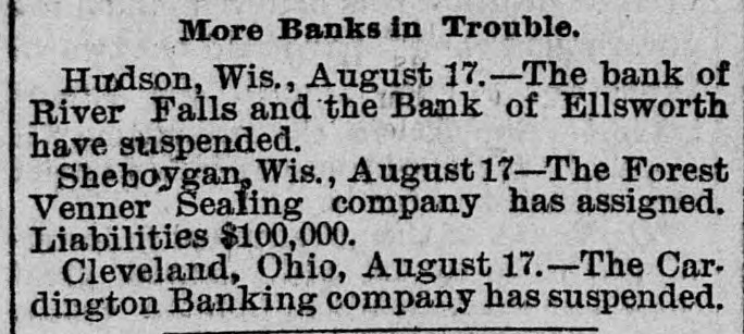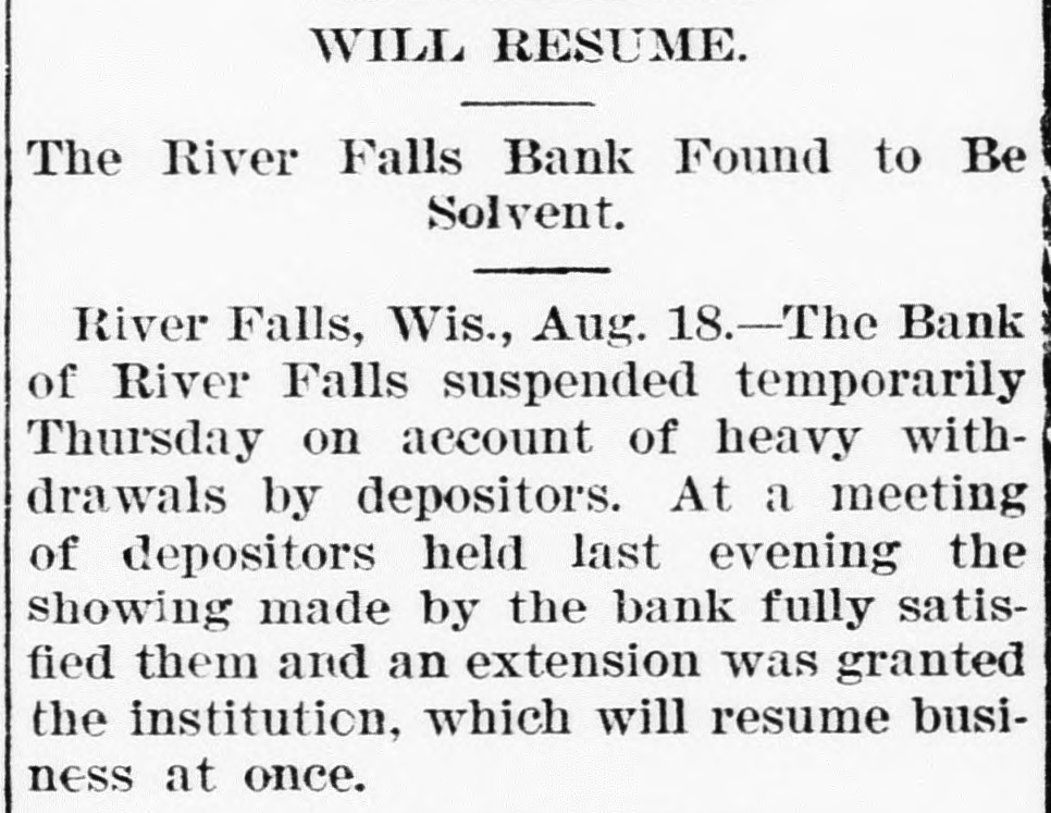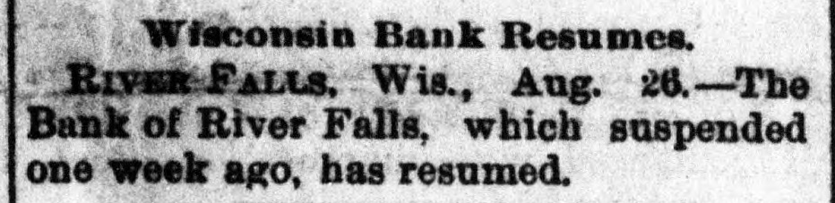 The Bank of River Falls finding it necessary to close its doors temporarily on account of the stringency of the times ... J. M. Smith, cashier of the bank, then gave a statement of the financial situation of the bank and the causes which had led to the suspension.