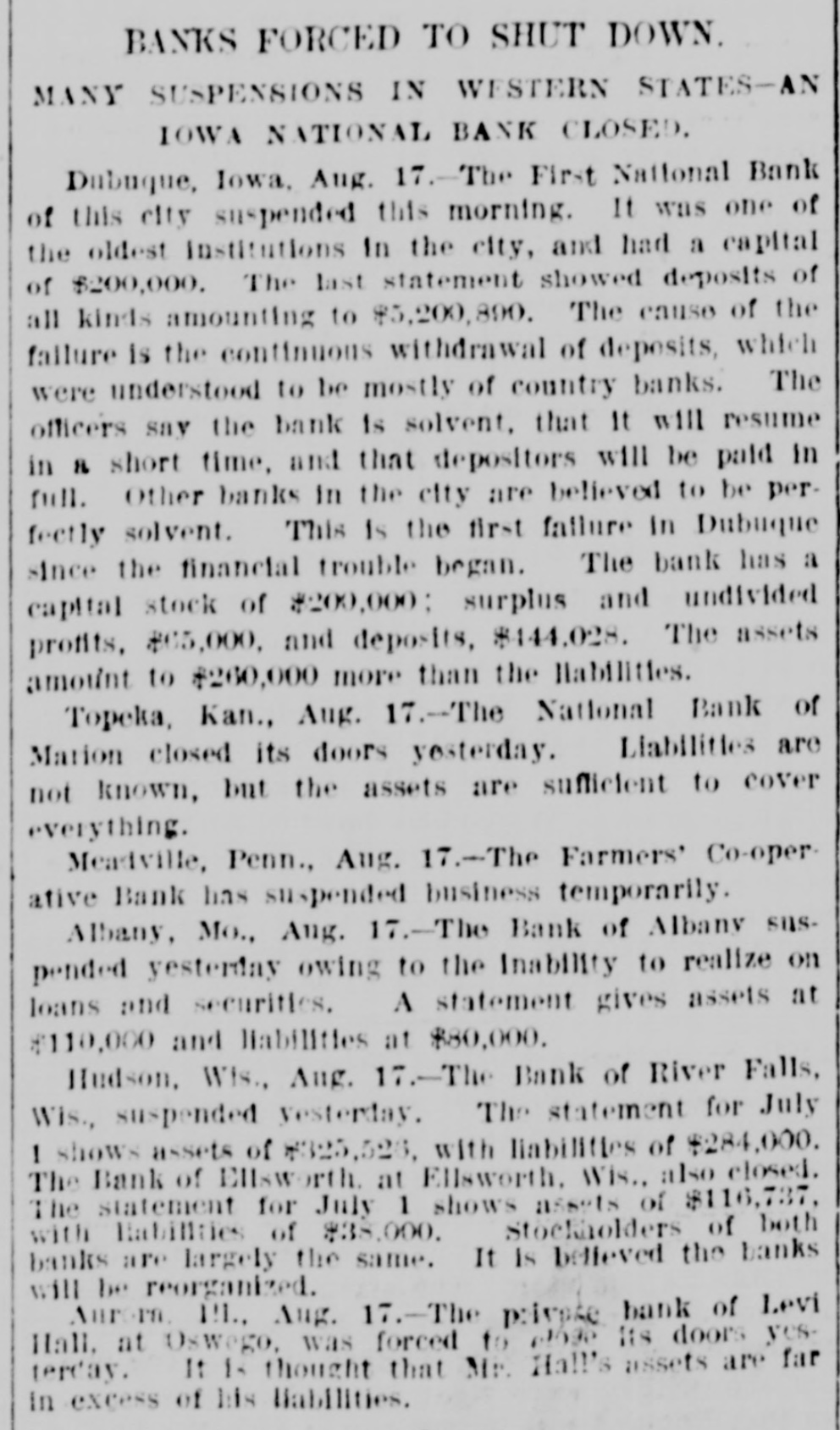 BANKS FORCED TO SHUT DOWN. MANY SUSPENSIONS IN WESTERN STATES-AN IOWA NATIONAL BANK CLOSED. Dubuque, Iowa, Aug. 17.-The First National Bank of this city suspended this morning. It was one of the oldest Institutions In the city, and had a capital of $200,000. The last statement showed deposits of all kinds amounting to $5,200,890. The cause of the failure is the continuous withdrawal of deposits, which were understood to be mostly of country banks. The officers say the bank Is solvent, that It will resume in a short time, and that depositors will be paid in full. Other banks in the city are believed to be perfectly solvent. This Is the first failure In Dubuque since the financial trouble began. The bank has a capital stock of $200,000; surplus and undivided profits, $65,000, and deposits, $444,028. The assets amount to $260,000 more than the Habilities. Topeka, Kan., Aug. 17.-The National Bank of Marion closed its doors yesterday. Liabilities are not known, but the assets are sufficient to cover everything. Meadville, Penn., Aug. 17.-The Farmers' Co-operative Bank has suspended business temporarily. Albany, Mo., Ang. 17.-The Bank of Albany suspended yesterday owing to the Inability to realize on loans and securities. A statement gives assets at $110,000 and Habilities at $80,000. Hudson, Wis., Aug. 17.-The Bank of River Falls, Wis., suspended yesterday. The statement for July 1 shows assets of $325,526, with liabilities of $284,000. The Bank of Ellsworth at Ellsworth. Wis., also closed. The statement for July 1 shows assets of $116,737, with Habilities of $38,000. Stockholders of both banks are largely the same. It Is believed the banks will be reorganized. Aurora. 1!1., Aug. 17.-The private bank of Levi Hall, at Oswego, was forced to eloge its doors yesterday. It 1. thought that Mr. Hall's assets are far in excess of his Habilities.